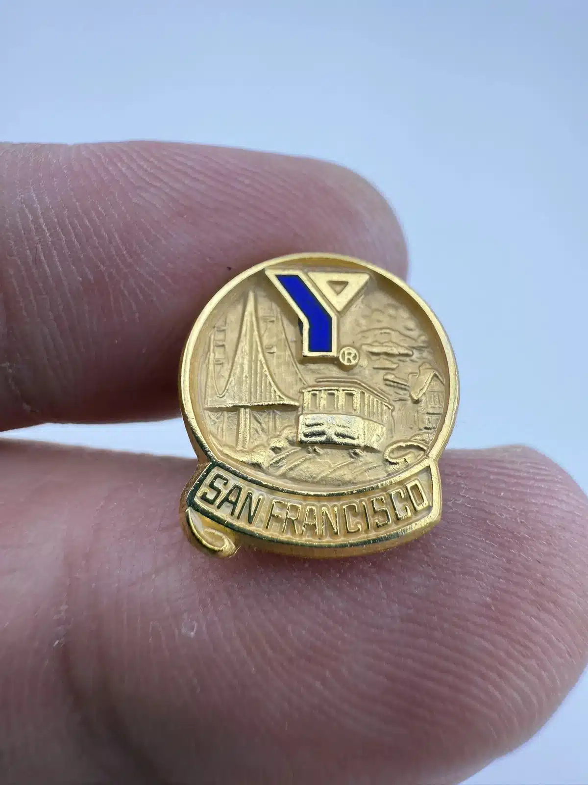 Hard to find pin from the YMCA in San Francisco, California. It features a cable car, bridge, rolling hill, and a building in the background.