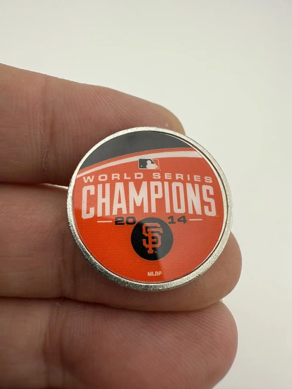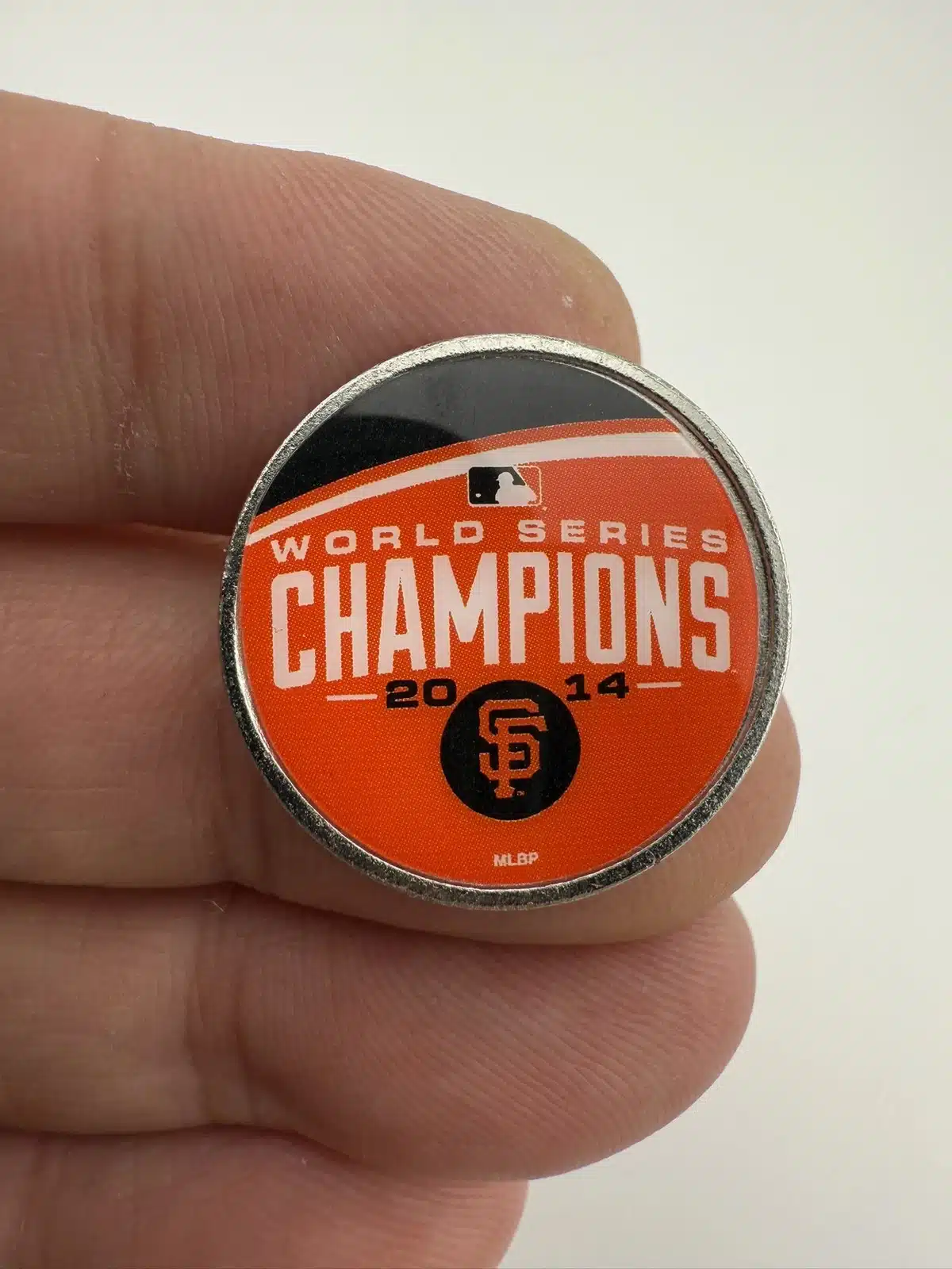 This pin commemorates the San Francisco Giants’ victory in the 2014 World Series, showcasing the team’s iconic orange and black colors. The Giants beat out the Kansas City Royals 4 to 3.