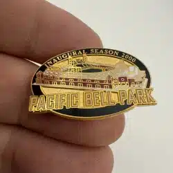 This pin commemorates the inaugural season of the San Francisco Giants at Pacific Bell Park in 2000, featuring the stadium’s distinctive structure. Designed by Peter David, it captures a significant moment in baseball history, celebrating the transition to a new era for the franchise.