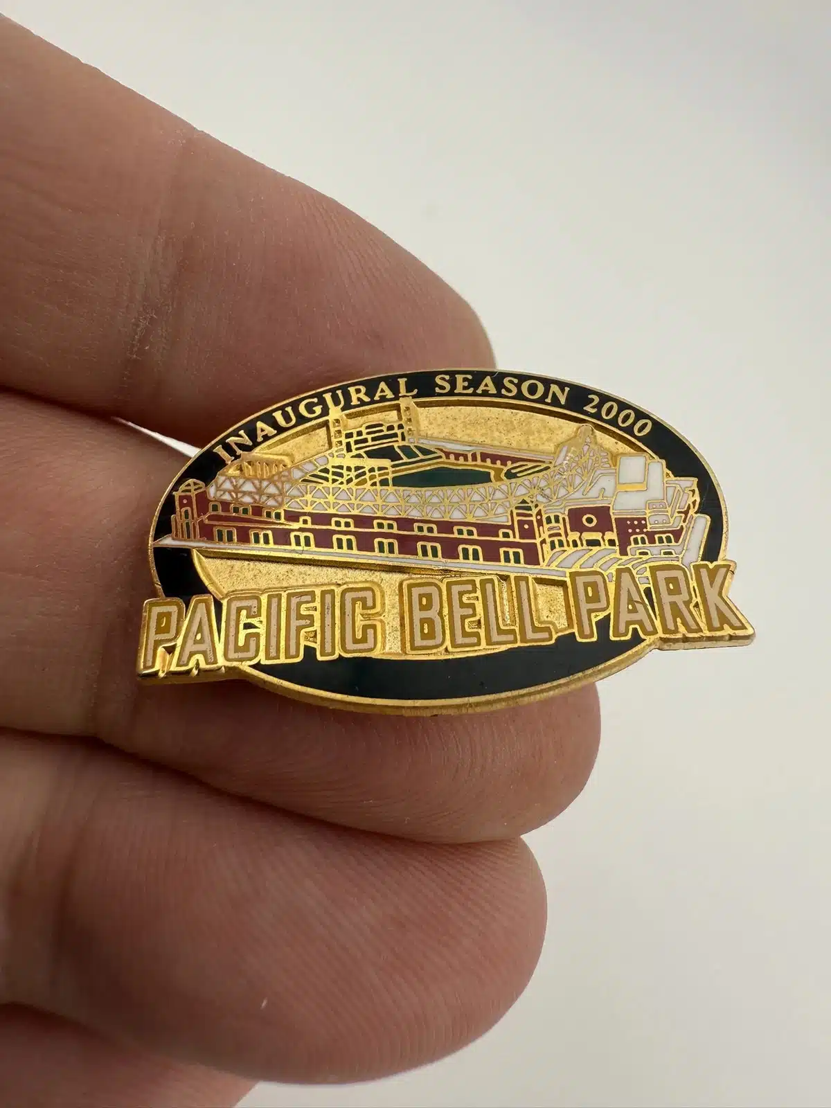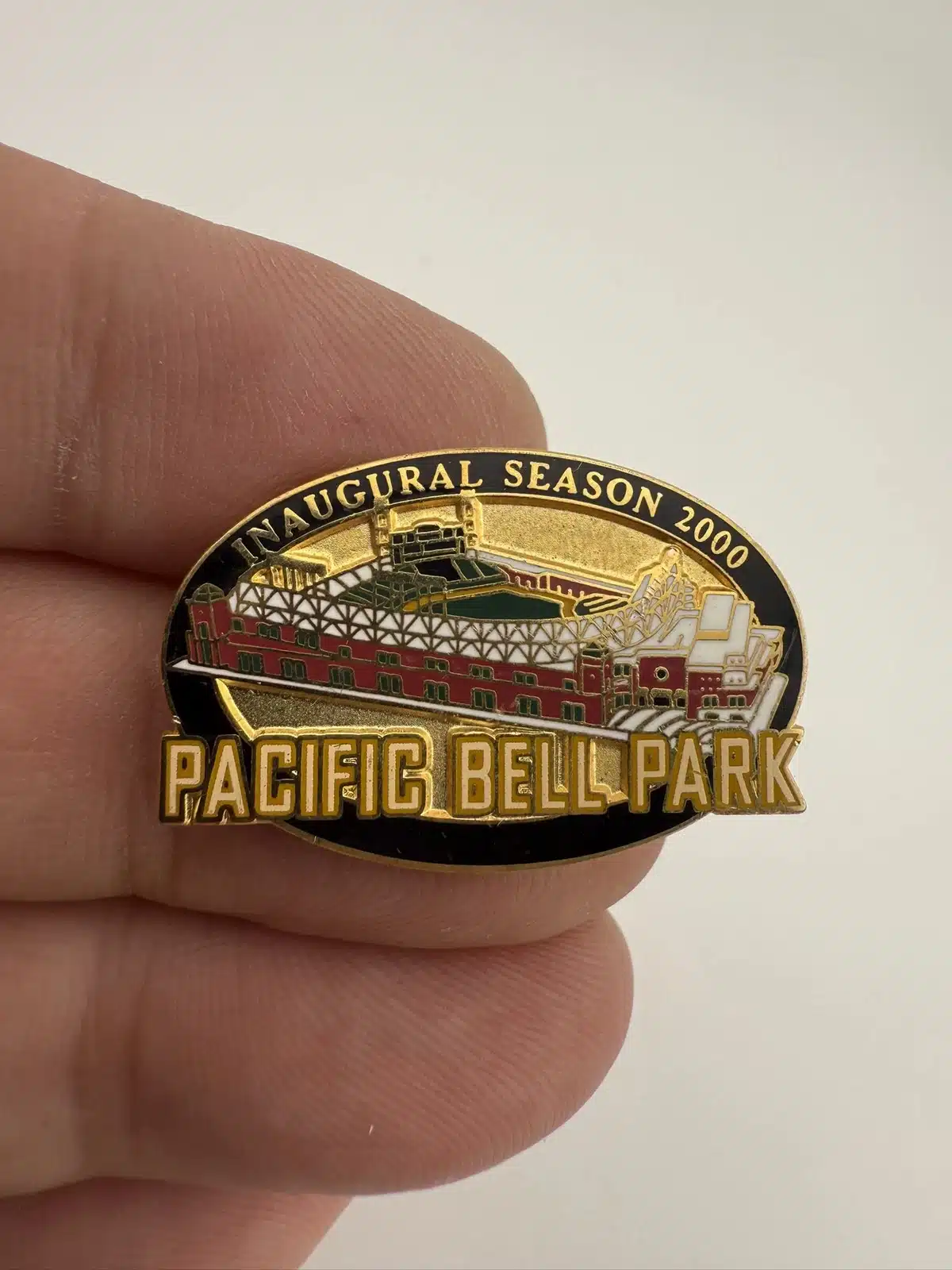 This pin commemorates the inaugural season of the San Francisco Giants at Pacific Bell Park in 2000, featuring the stadium’s distinctive structure. Designed by Peter David, it captures a significant moment in baseball history, celebrating the transition to a new era for the franchise.