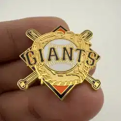 San Francisco Giants pin featuring a baseball, glove, and crossed bats, created by Peter David. A solid choice for baseball collectors who like detailed, vintage-style pieces.