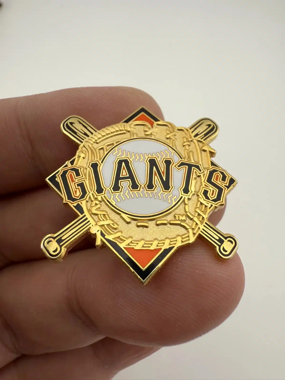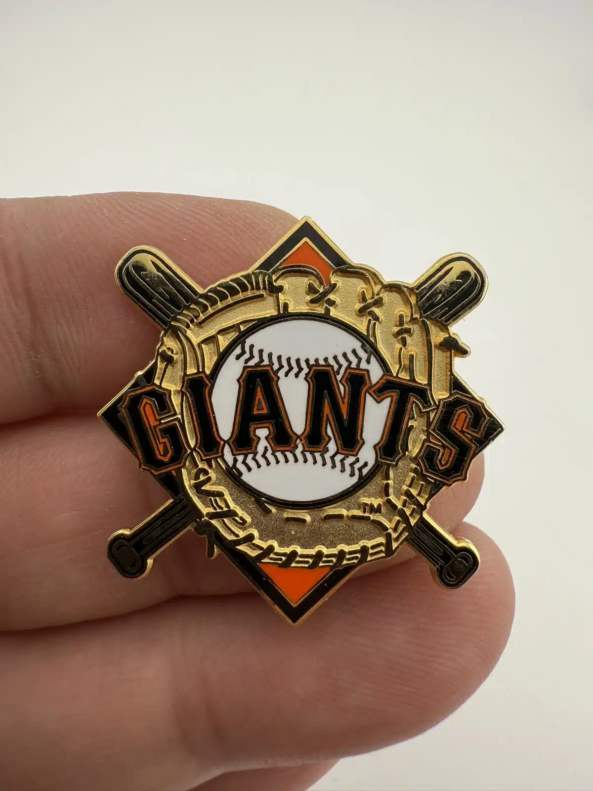 San Francisco Giants pin featuring a baseball, glove, and crossed bats, created by Peter David. A solid choice for baseball collectors who like detailed, vintage-style pieces.
