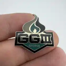 This pin features the initials ‘GGIII’ prominently displayed, with the name ‘George’ elegantly positioned below. The design incorporates a flame motif at the top and showcases the San Jose Sharks’ team colors, reflecting the team’s identity and honoring George Gund III’s contributions to the franchise.