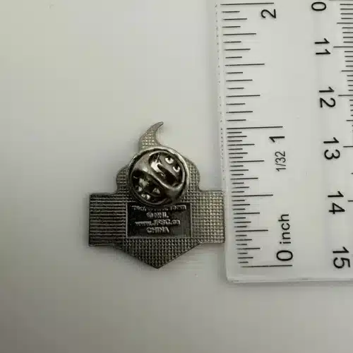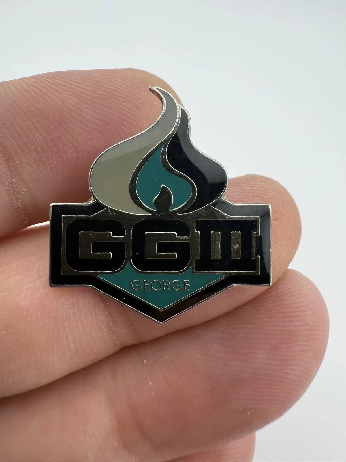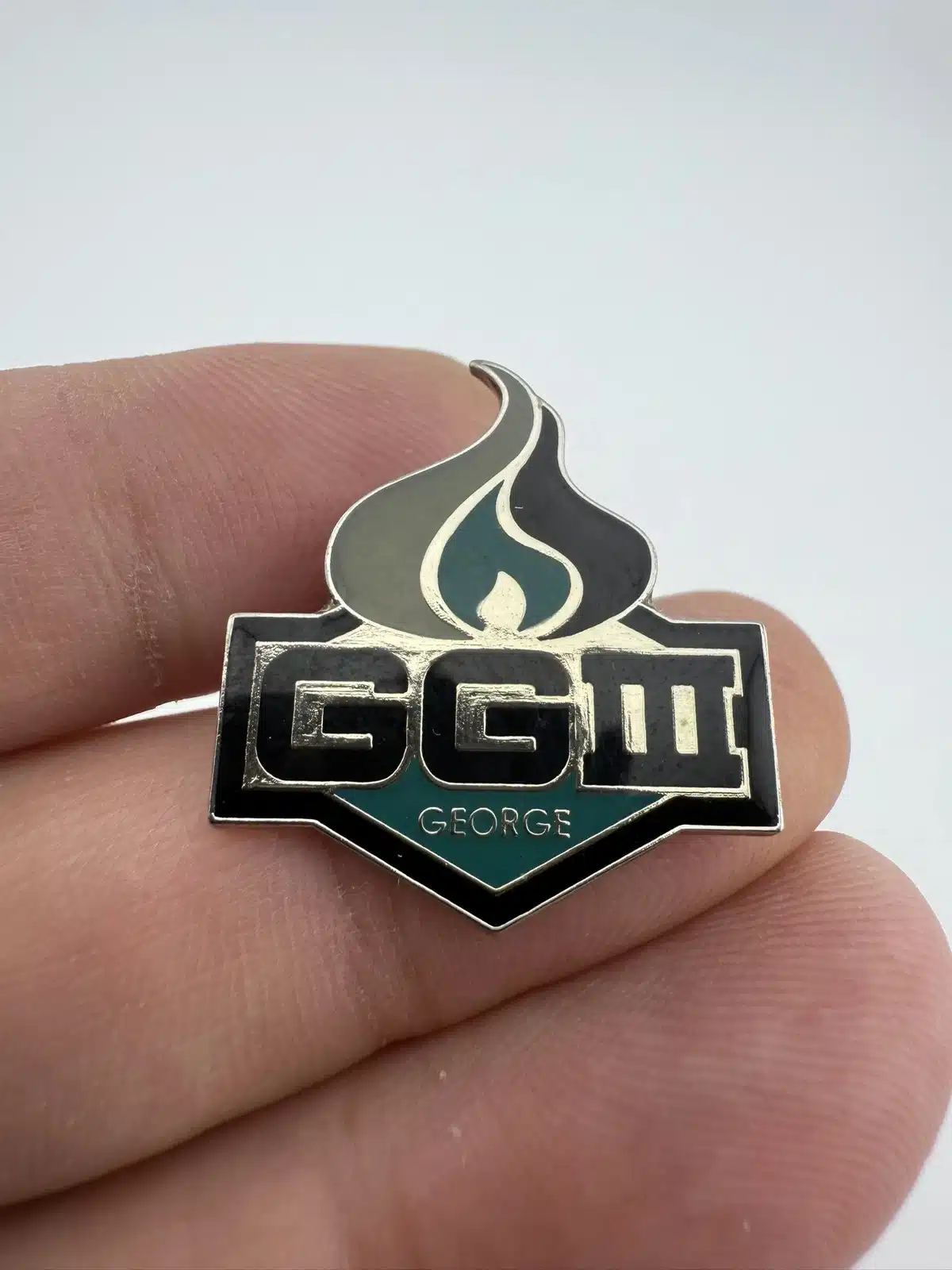 This pin features the initials ‘GGIII’ prominently displayed, with the name ‘George’ elegantly positioned below. The design incorporates a flame motif at the top and showcases the San Jose Sharks’ team colors, reflecting the team’s identity and honoring George Gund III’s contributions to the franchise.