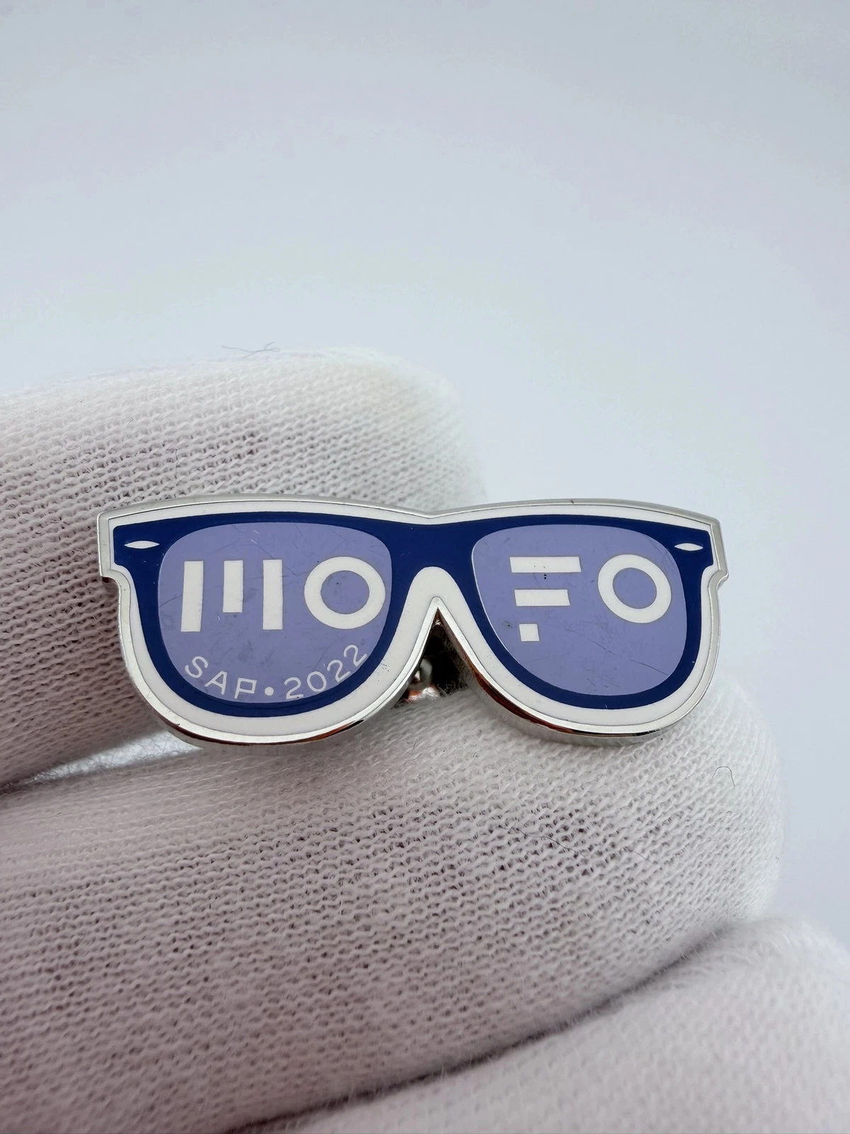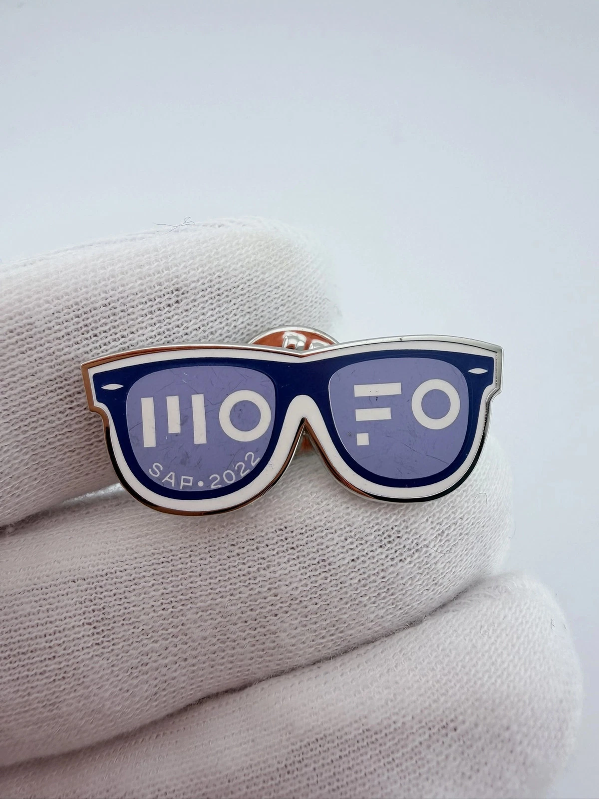 This pin is shaped like a pair of glasses with a purple frame and light purple lenses. One lens displays the text SAP 2022, creating a clean and modern tech-themed design.