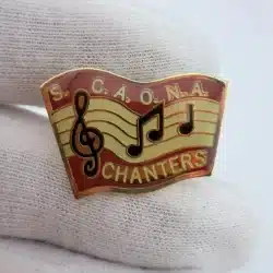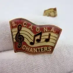 These pins prominently display the letters ‘S.C.A.O.N.A.’ at the top, representing the Shrine Chanters Association of North America, with ‘CHANTERS’ elegantly positioned at the bottom. The design is enhanced by a treble clef on the far left and two musical notes in the center, symbolizing the musical focus of the association.