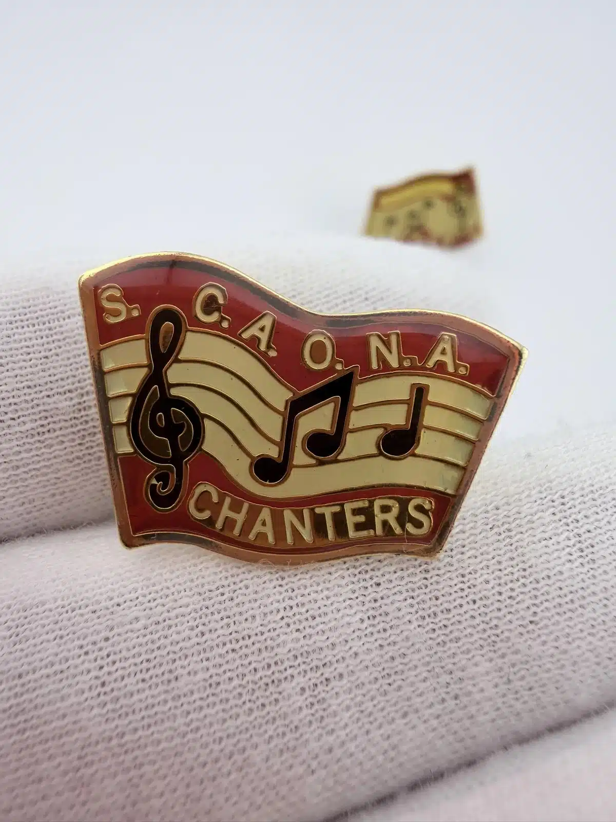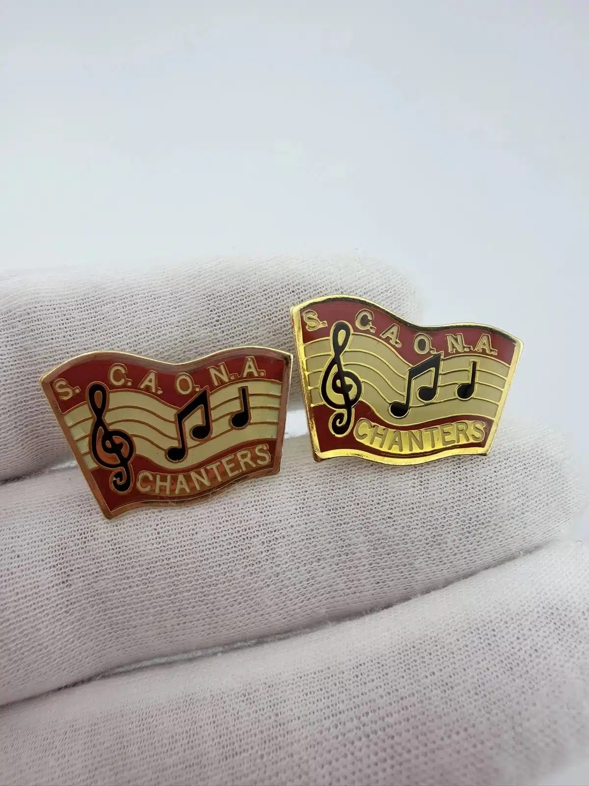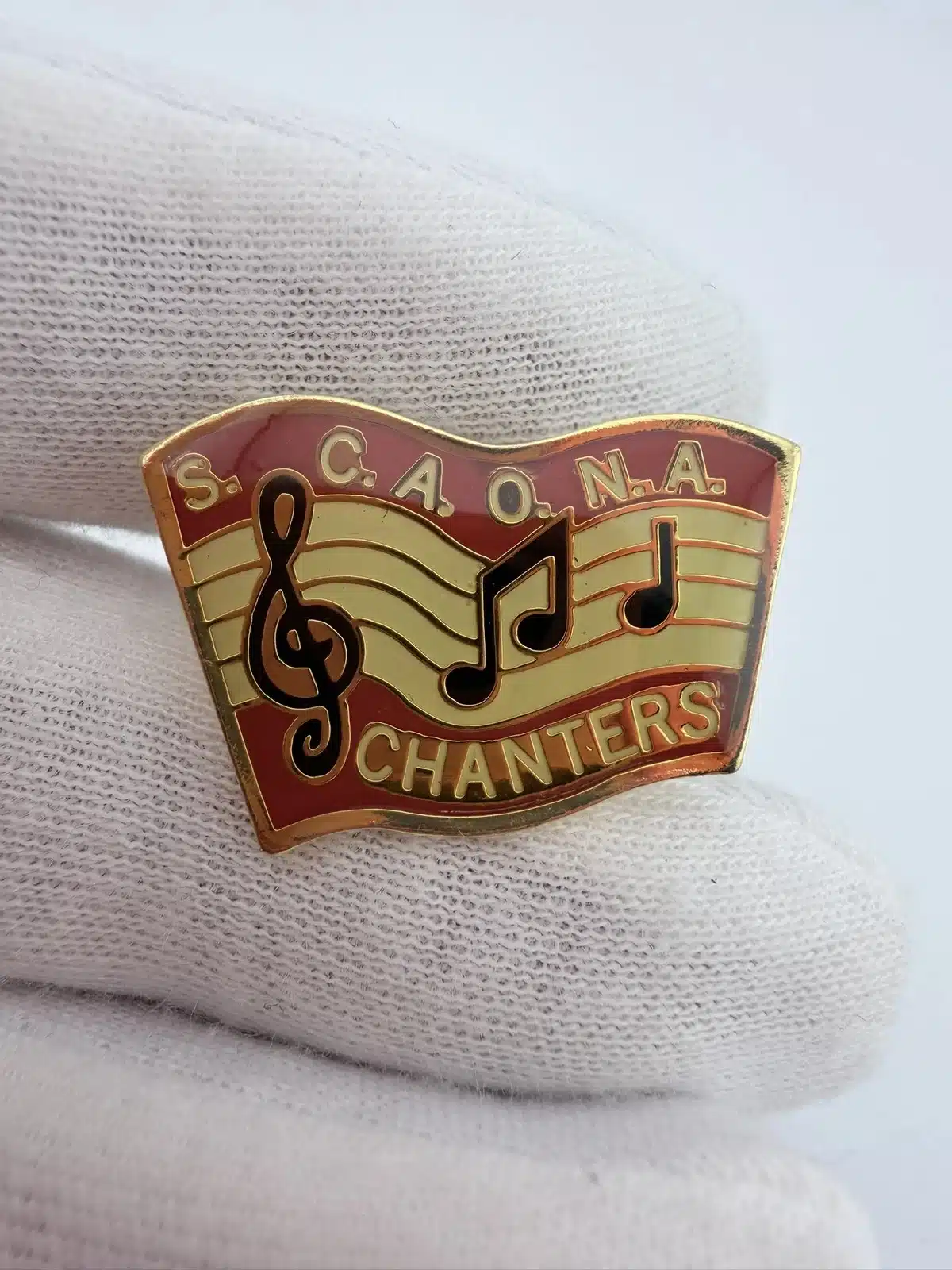 These pins prominently display the letters ‘S.C.A.O.N.A.’ at the top, representing the Shrine Chanters Association of North America, with ‘CHANTERS’ elegantly positioned at the bottom. The design is enhanced by a treble clef on the far left and two musical notes in the center, symbolizing the musical focus of the association.