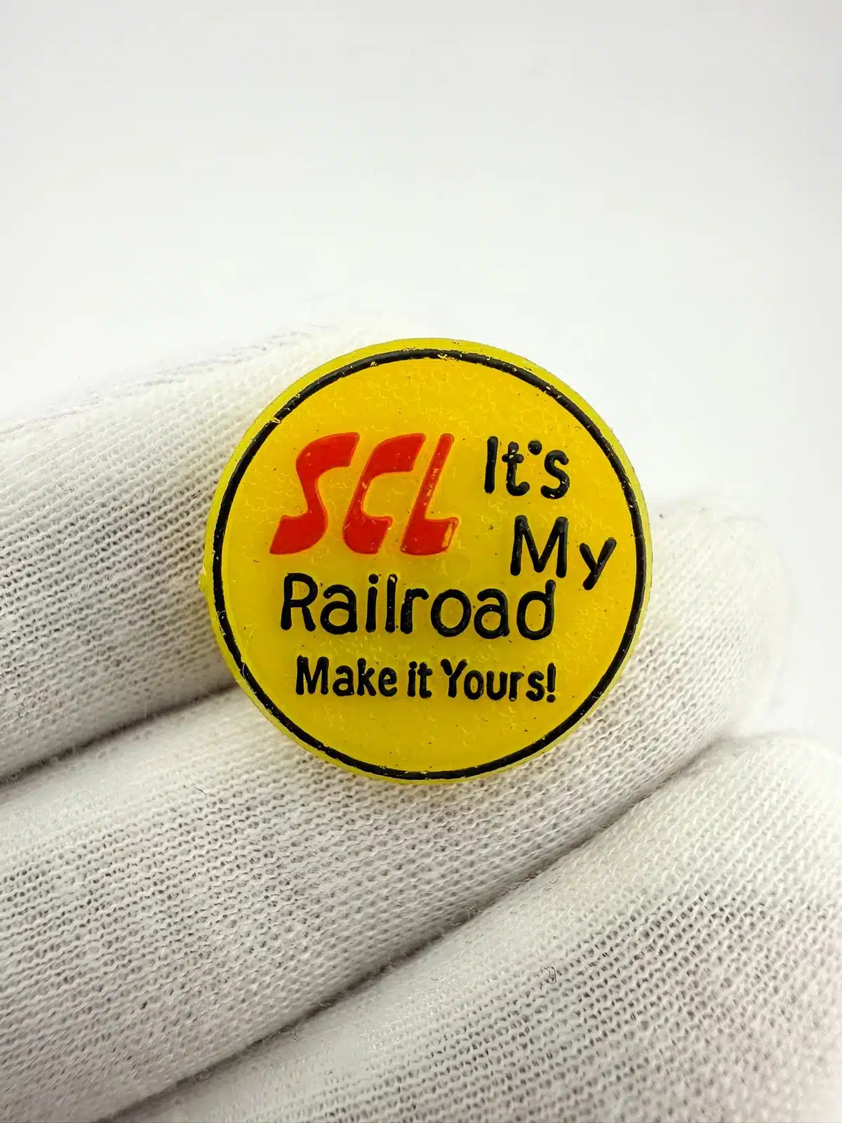 This vibrant yellow plastic pin features the bold red letters ‘SCL’ prominently displayed, alongside the phrase ‘It’s My Railroad Make It Yours!’ in striking black. The design reflects the pride and identity associated with the Seaboard Coast Line, a significant player in American railroading history. Unknown age.