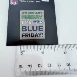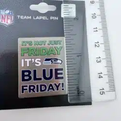 This vibrant lapel pin features the phrase ‘It’s Not Just Friday It’s Blue Friday!’ in green, white, and blue. The design is completed with the iconic Seattle Seahawks logo, celebrating the team’s spirit and enthusiasm for game day.