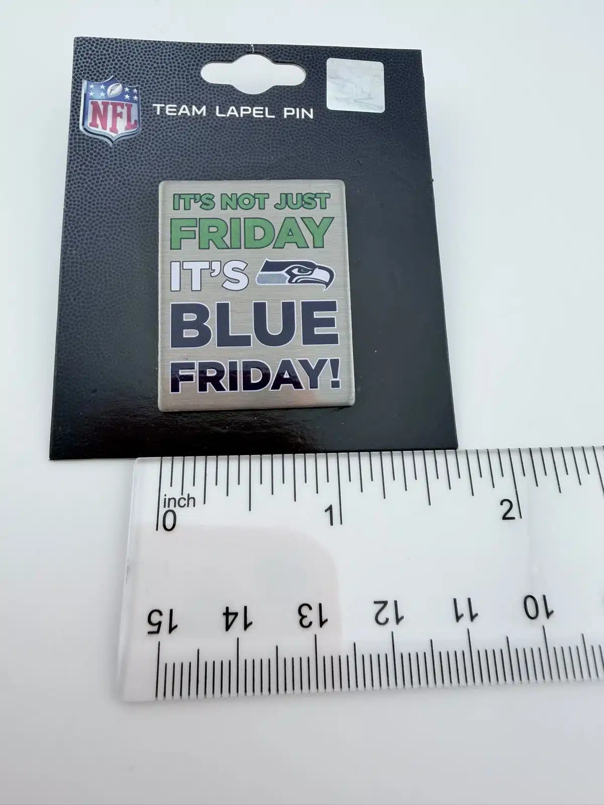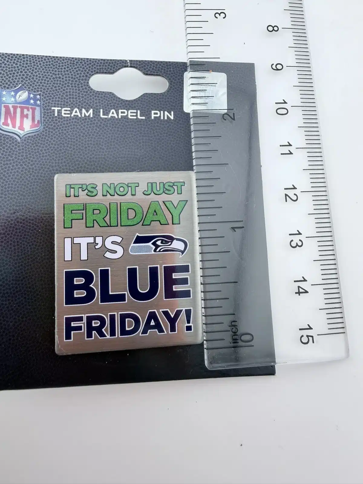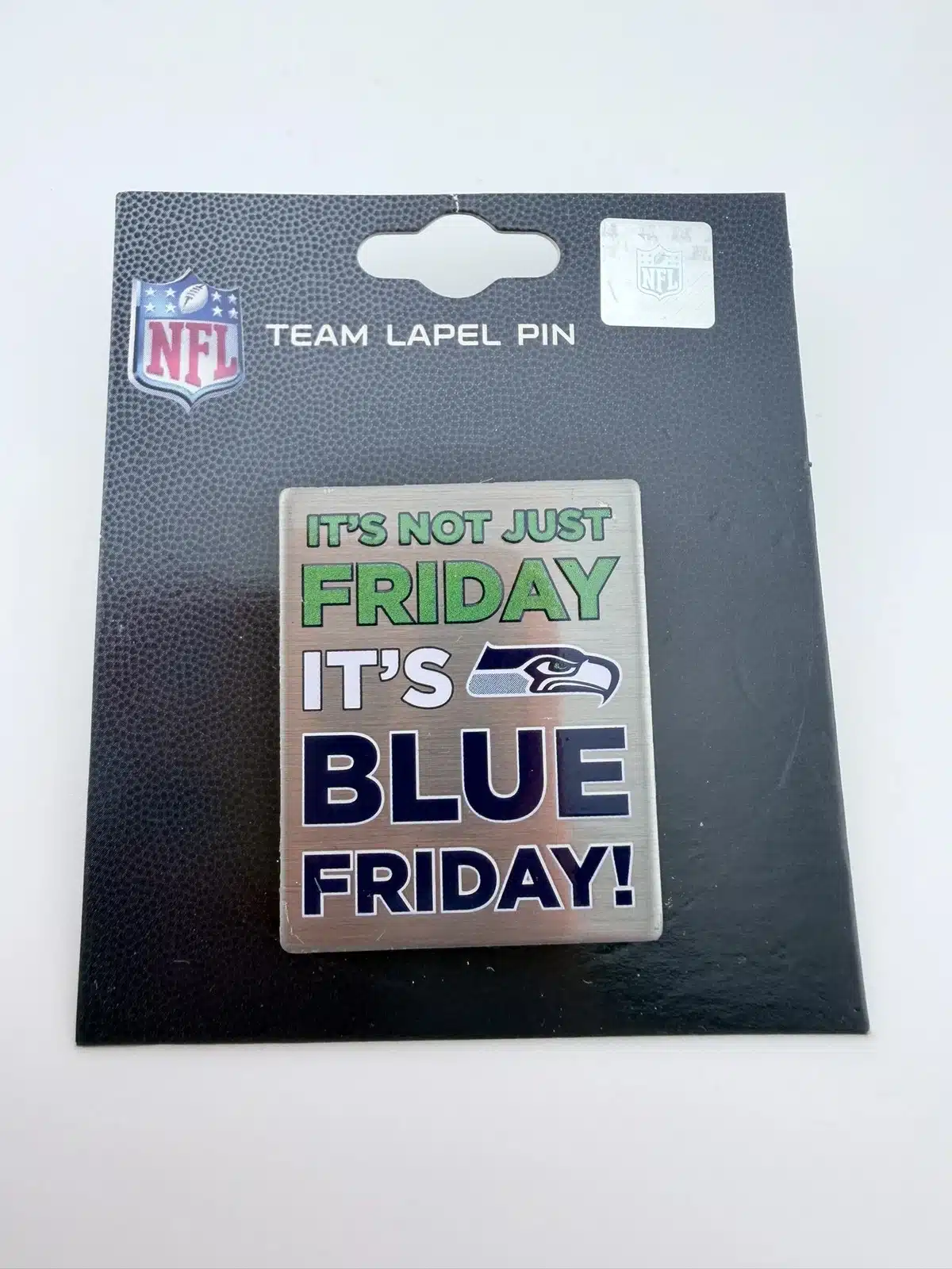 This vibrant lapel pin features the phrase ‘It’s Not Just Friday It’s Blue Friday!’ in green, white, and blue. The design is completed with the iconic Seattle Seahawks logo, celebrating the team’s spirit and enthusiasm for game day.