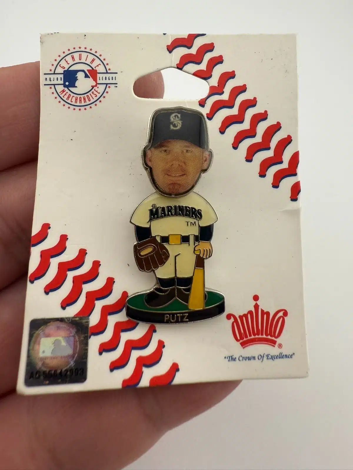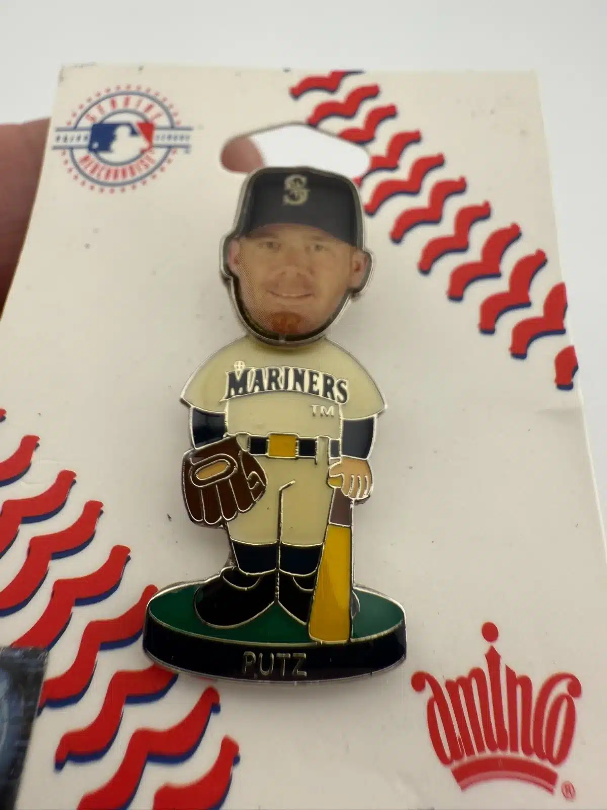 The Seattle Mariners J.J. Putz Bobble Head Style Pin features the likeness of the closer pitcher, capturing his iconic look.