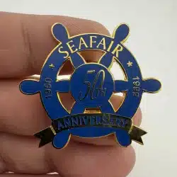This commemorative lapel pin celebrates the 50th anniversary of Seattle Seafair, a beloved summer festival that began in 1950.