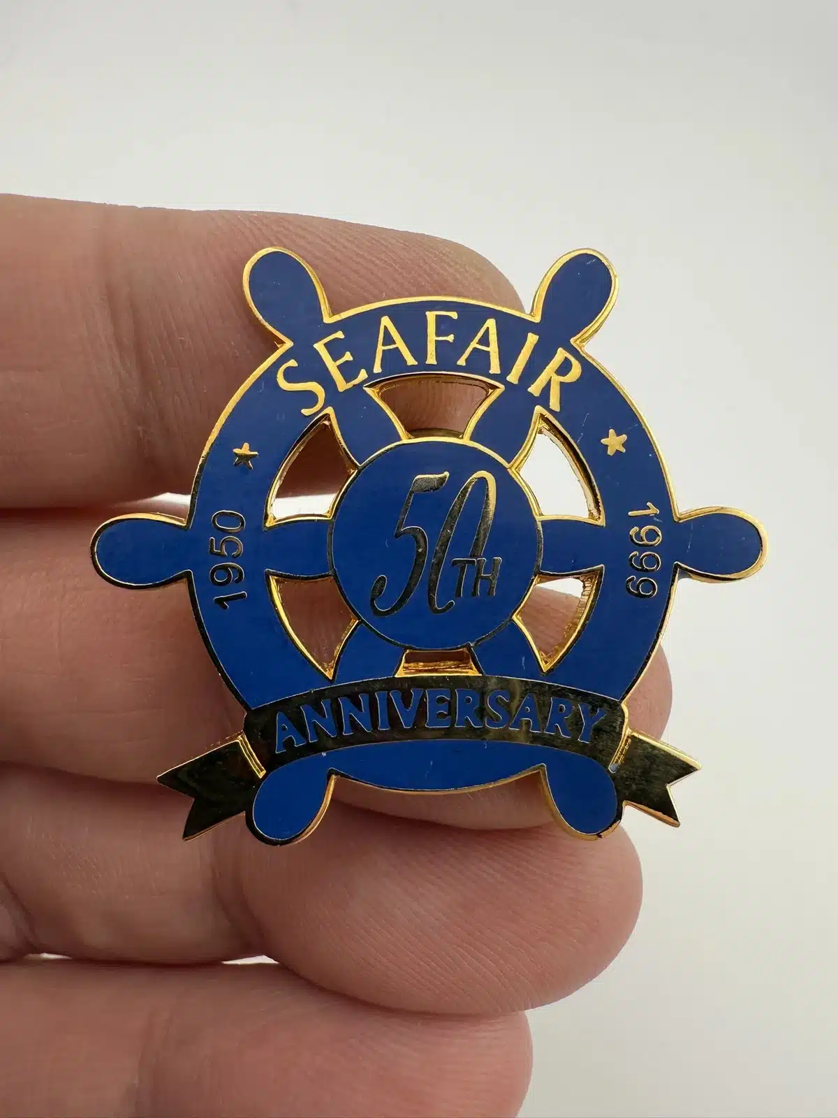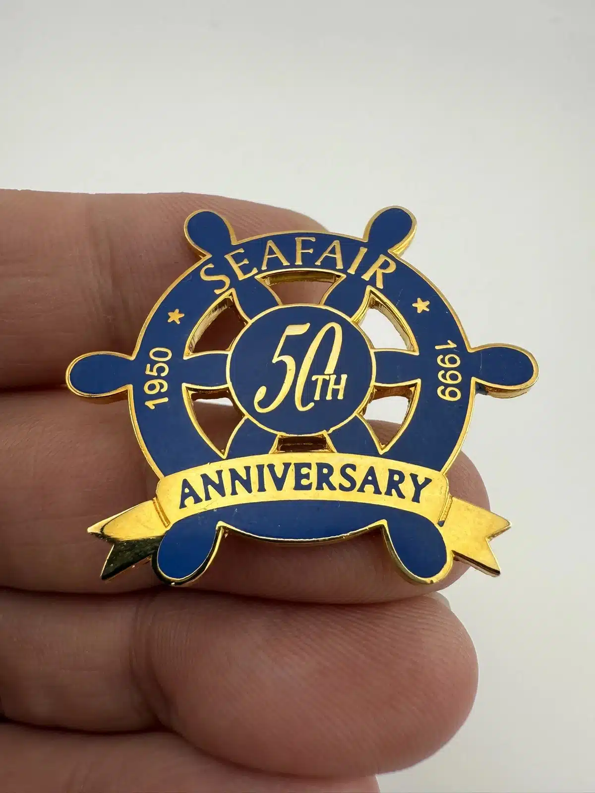 This commemorative lapel pin celebrates the 50th anniversary of Seattle Seafair, a beloved summer festival that began in 1950.