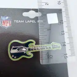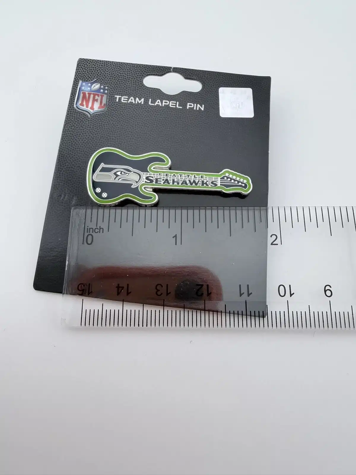 This 2016 Seattle Seahawks guitar-shaped lapel hat pin from PSG measures 1.75 inches in width by approximately 3/4 inch in height. The fretboard displays the words “Seattle Seahawks,” while the body of the guitar features the Seahawks logo.