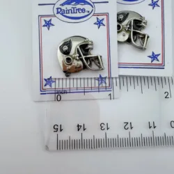 This set includes two three dimensional pins shaped like football helmets with a silver tone finish. Each helmet displays the Los Angeles Raiders logo on the side, though the logo is not sharply detailed.