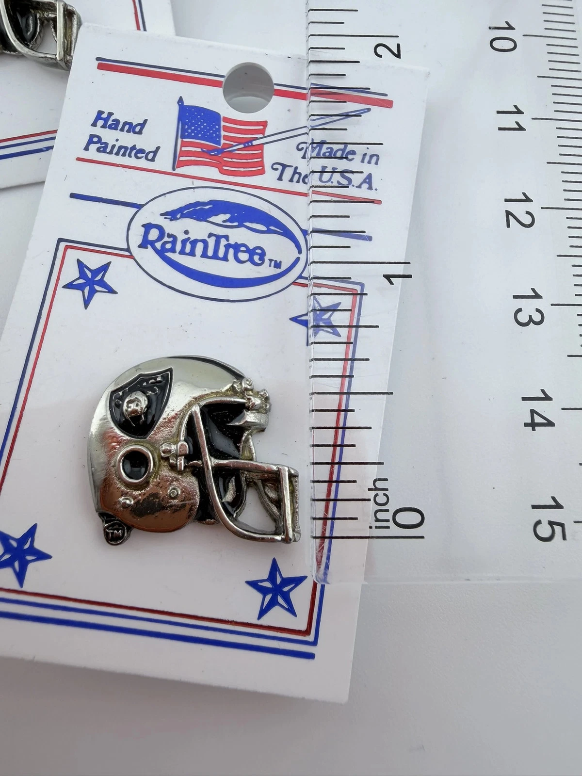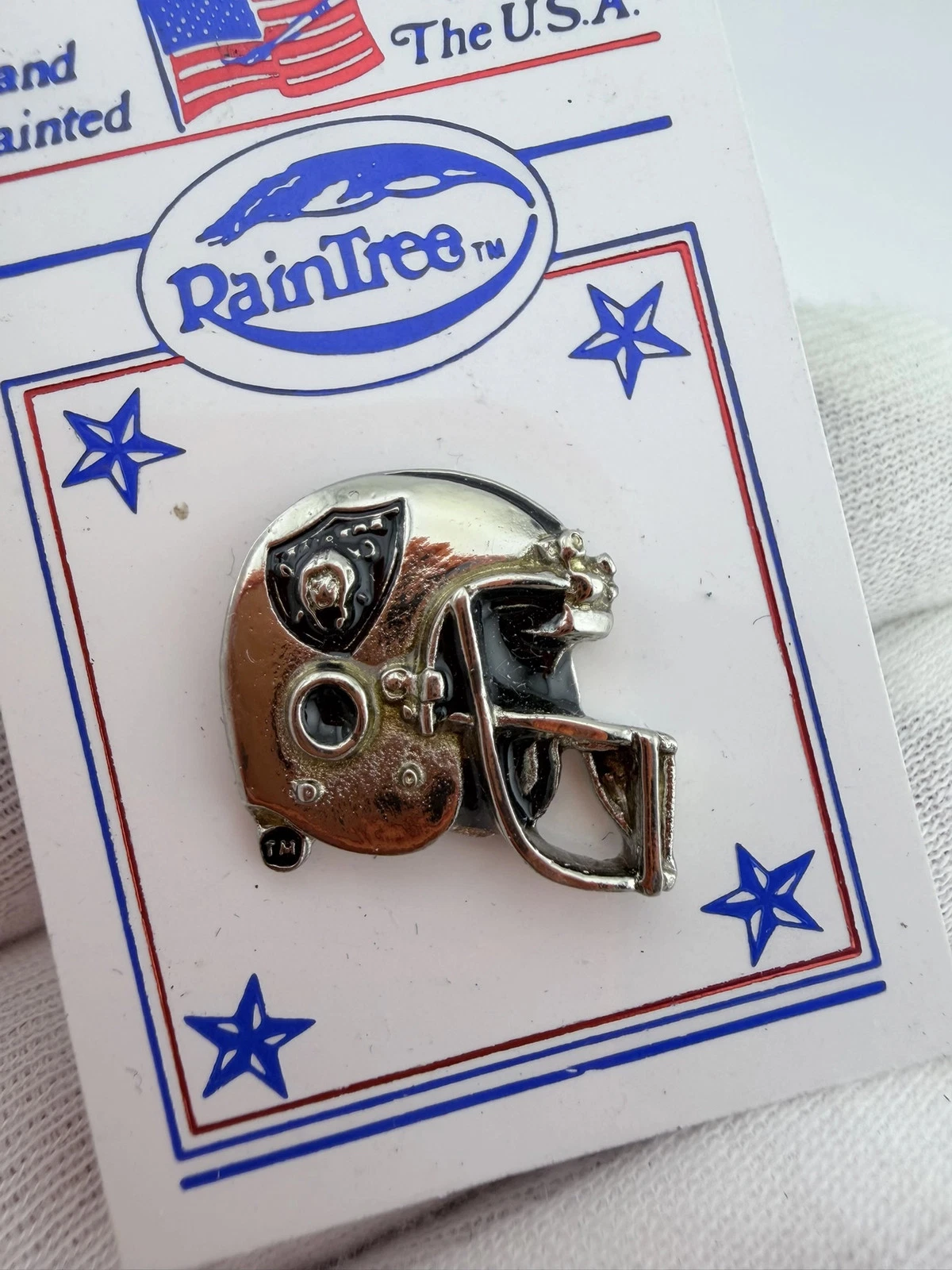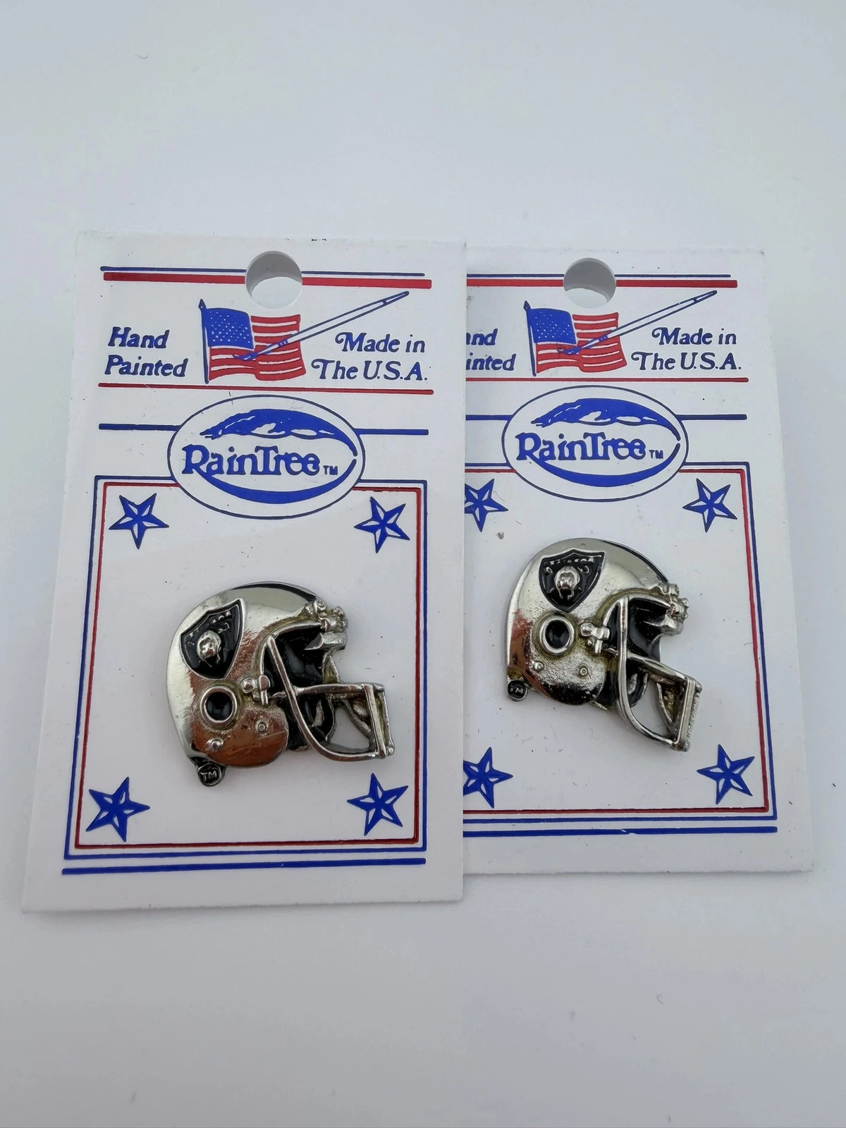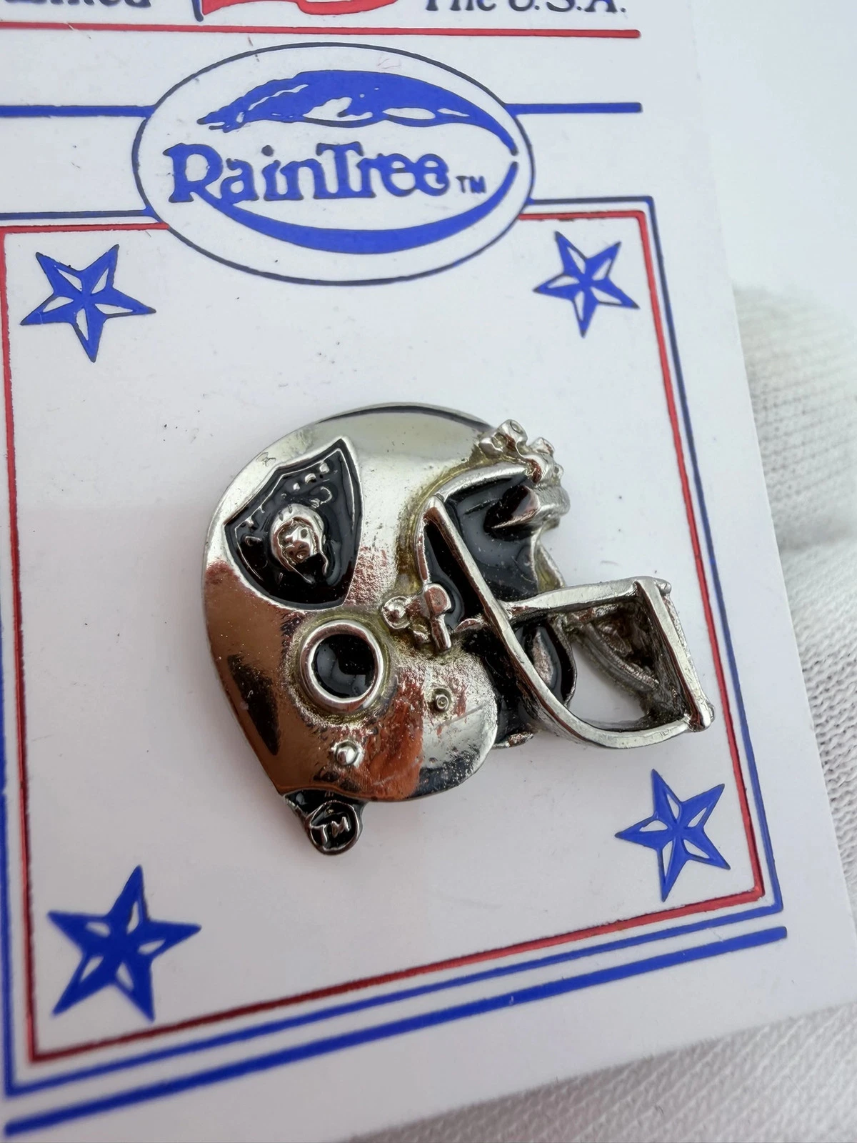 The Los Angeles Raiders were an NFL team based in Los Angeles during portions of their history and are now known as the Las Vegas Raiders. Their helmet logo is one of the most recognizable designs in football, and RainTree is known for producing officially licensed sports pins and memorabilia.