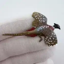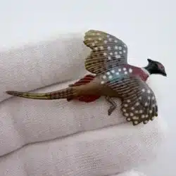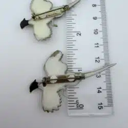 This set of two pheasant brooches features intricately detailed designs with distinctive white dots, showcasing the beauty of these birds. Crafted from lightweight plastic, these vintage pins reflect a charming and artistic interpretation of pheasants, making them a delightful addition to any collection.