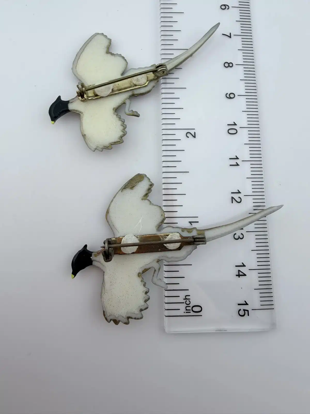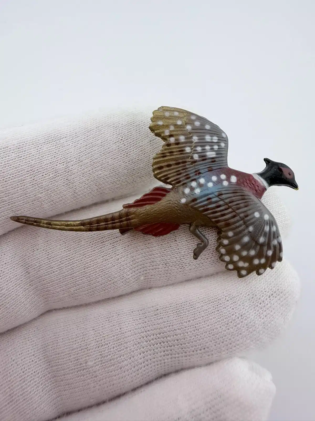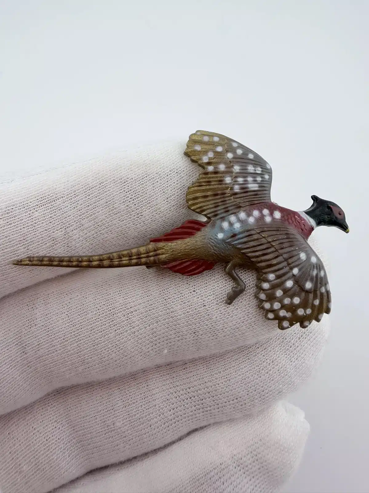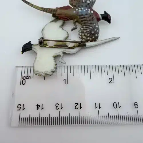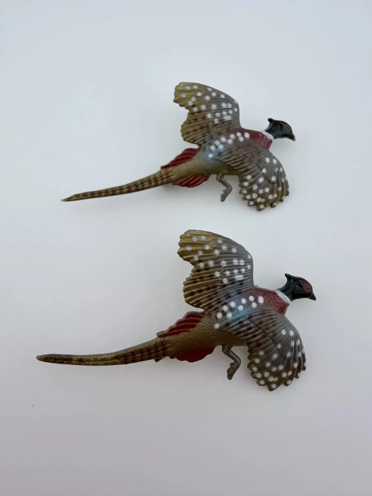 This set of two pheasant brooches features intricately detailed designs with distinctive white dots, showcasing the beauty of these birds. Crafted from lightweight plastic, these vintage pins reflect a charming and artistic interpretation of pheasants, making them a delightful addition to any collection.