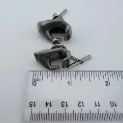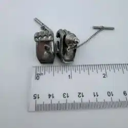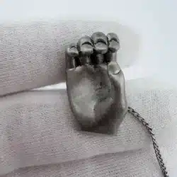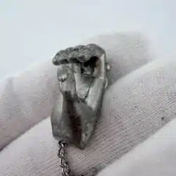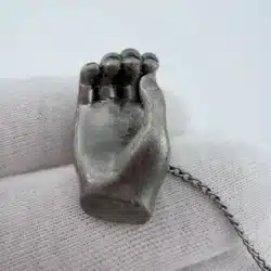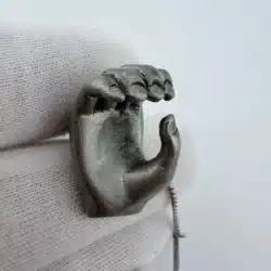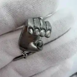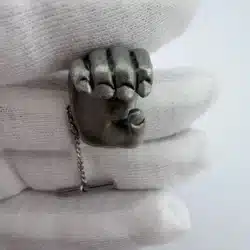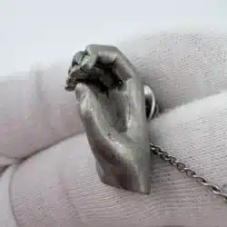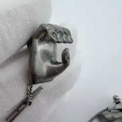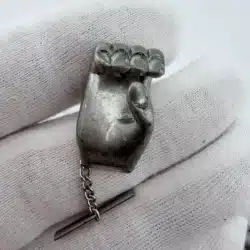 This set of two tie tack pins features grey-toned hands, one resembling a woman’s and the other a man’s, each possibly forming the letter ‘C’ in American Sign Language (ASL). The design captures the essence of communication through sign language, making it a notable representation of inclusivity and expression. Both pins could possibly hold a ribbon as well, unsure on the original purpose.