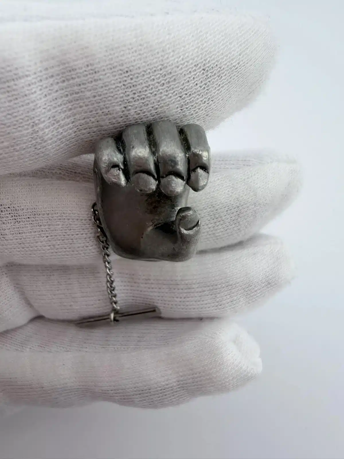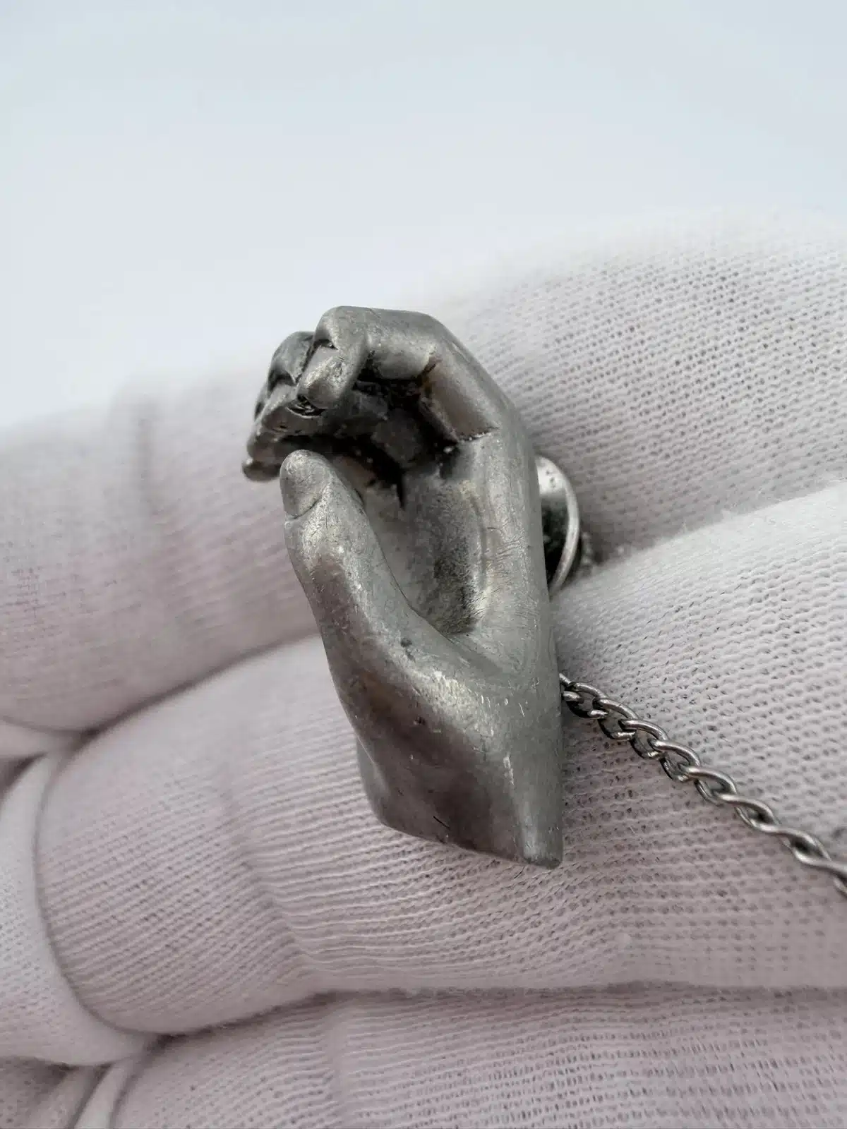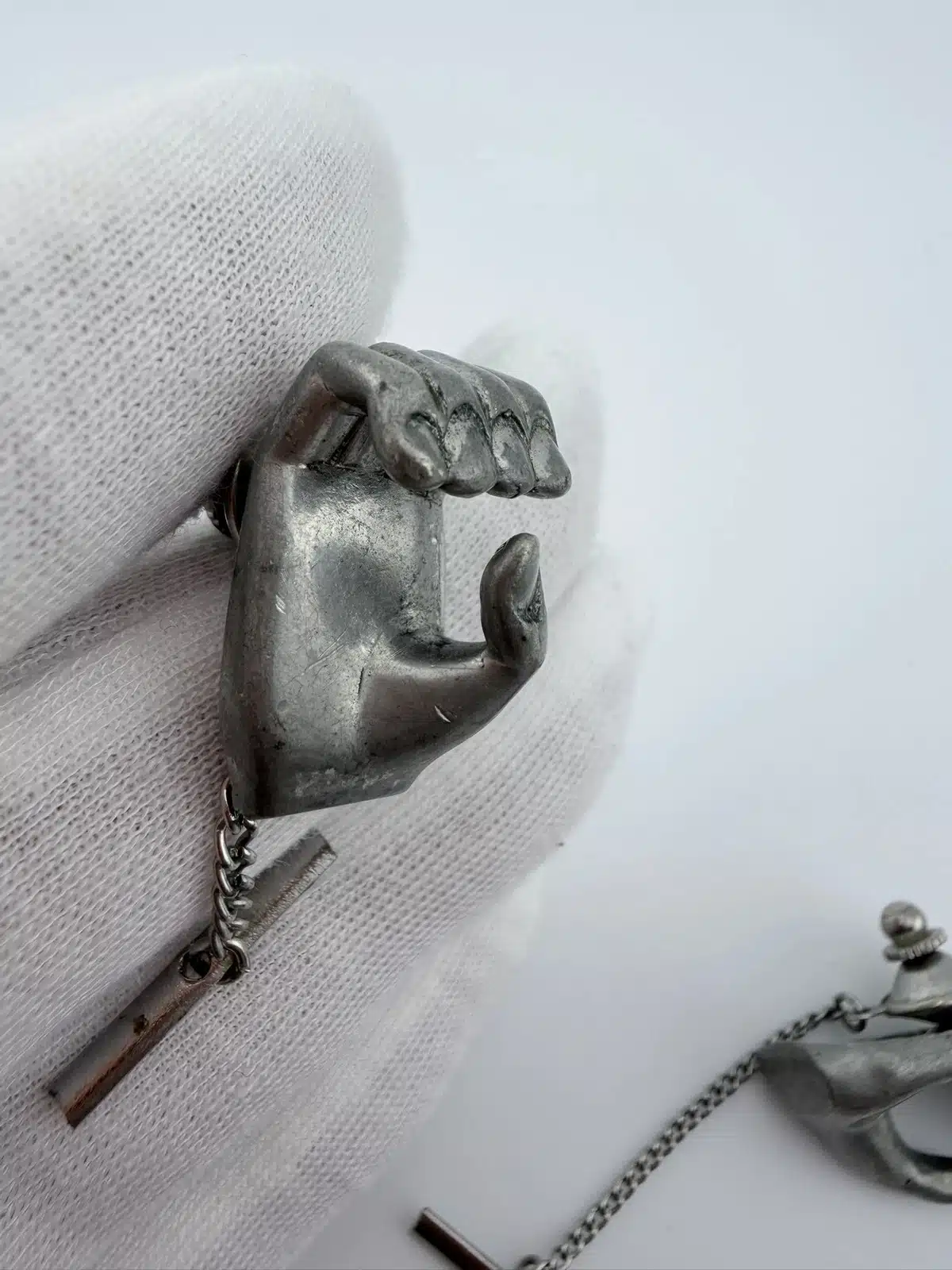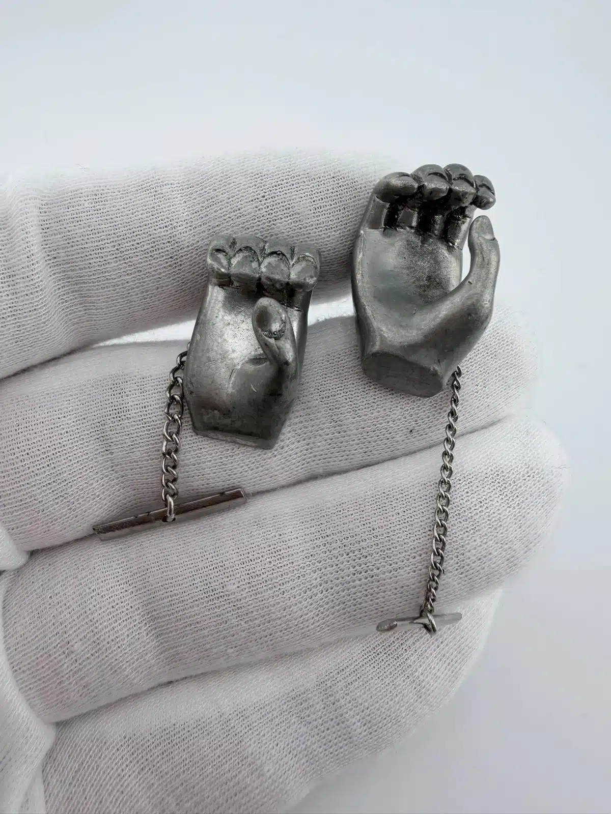 This set of two tie tack pins features grey-toned hands, one resembling a woman’s and the other a man’s, each possibly forming the letter ‘C’ in American Sign Language (ASL). The design captures the essence of communication through sign language, making it a notable representation of inclusivity and expression. Both pins could possibly hold a ribbon as well, unsure on the original purpose.
