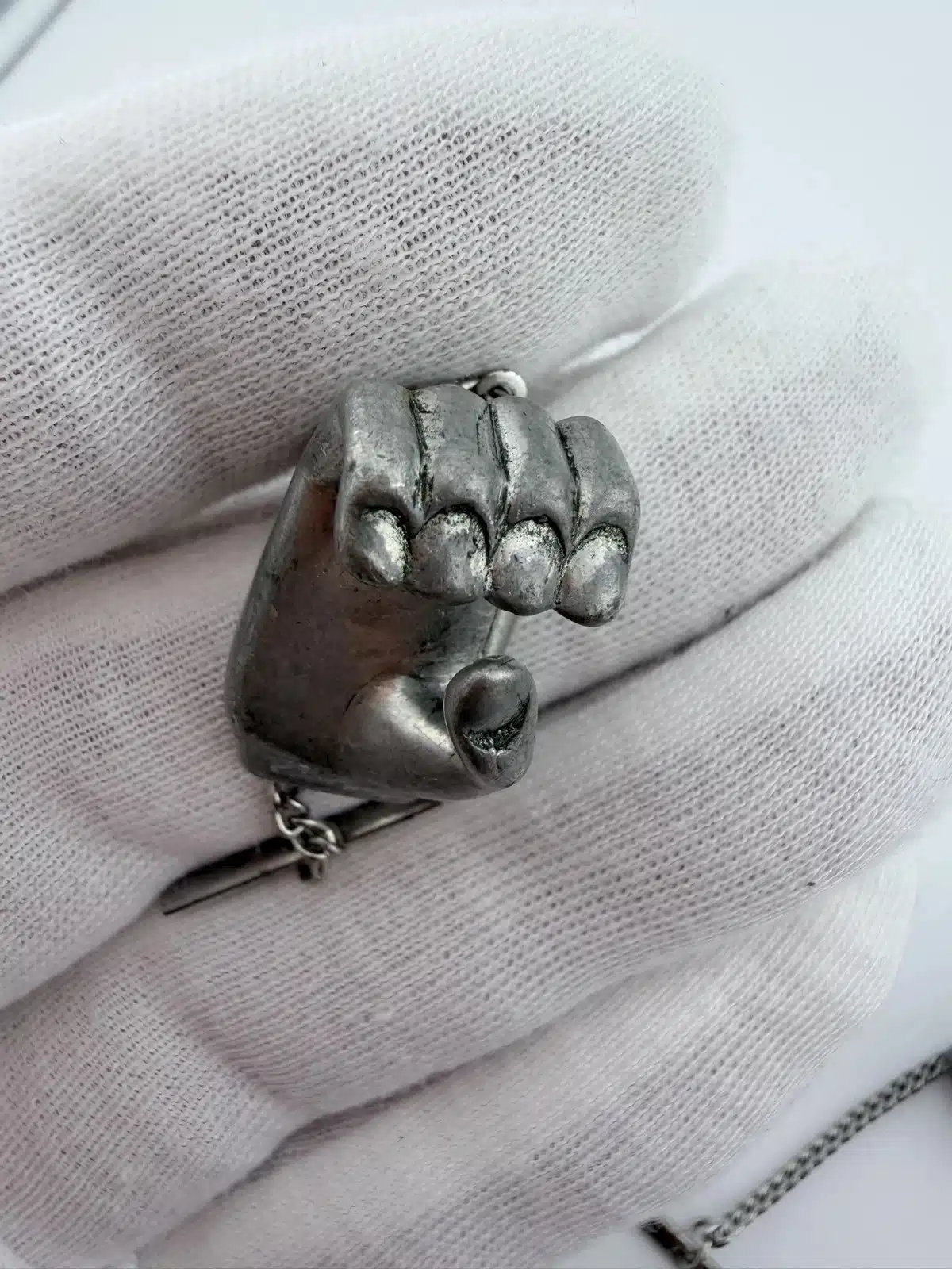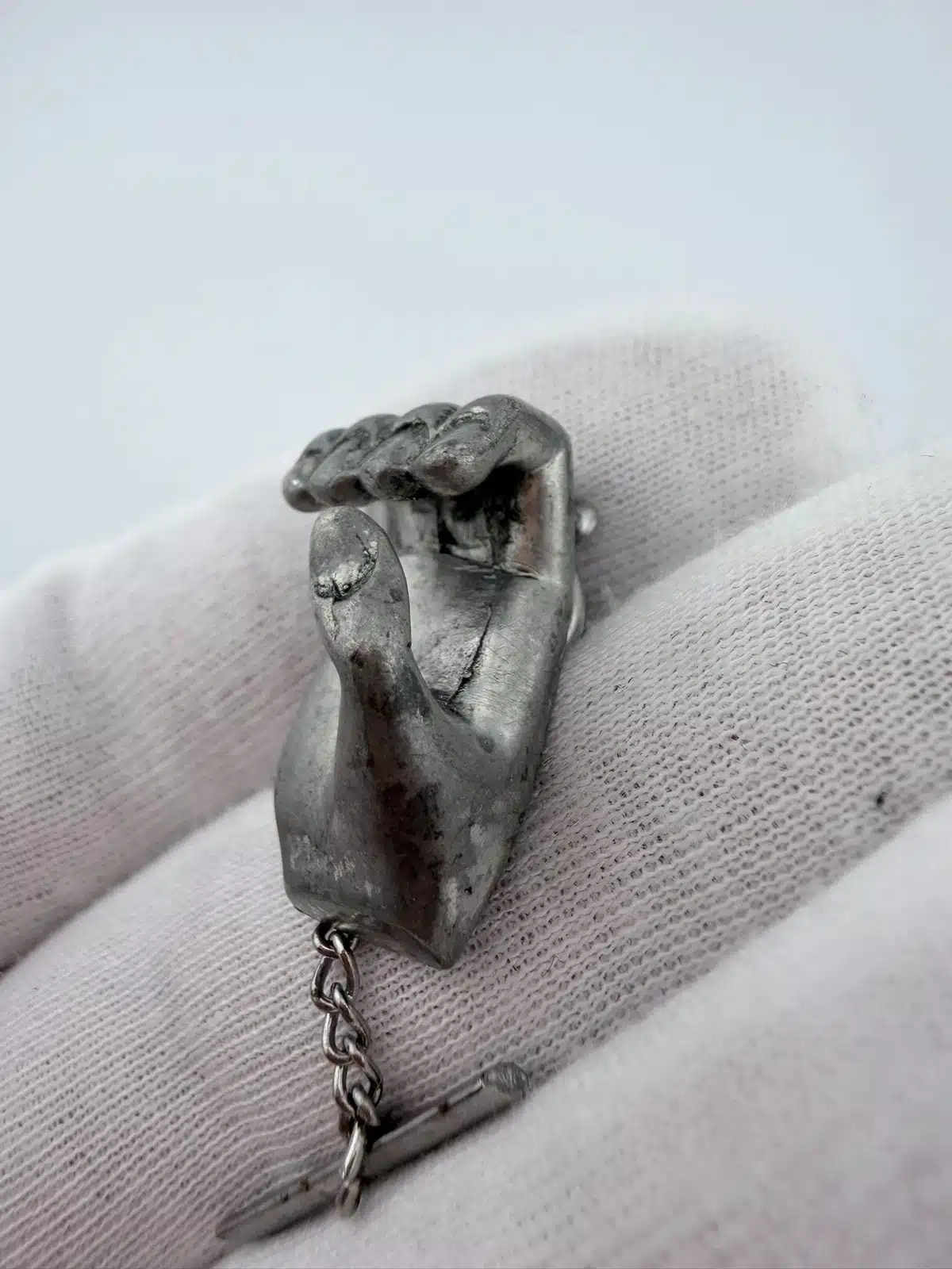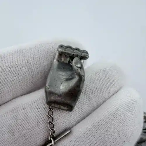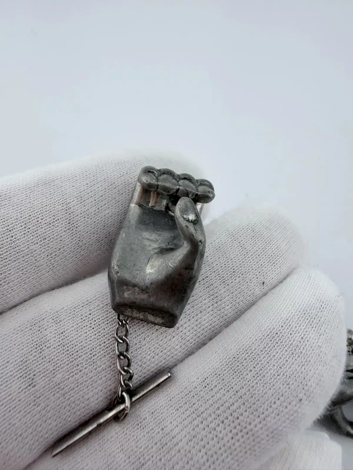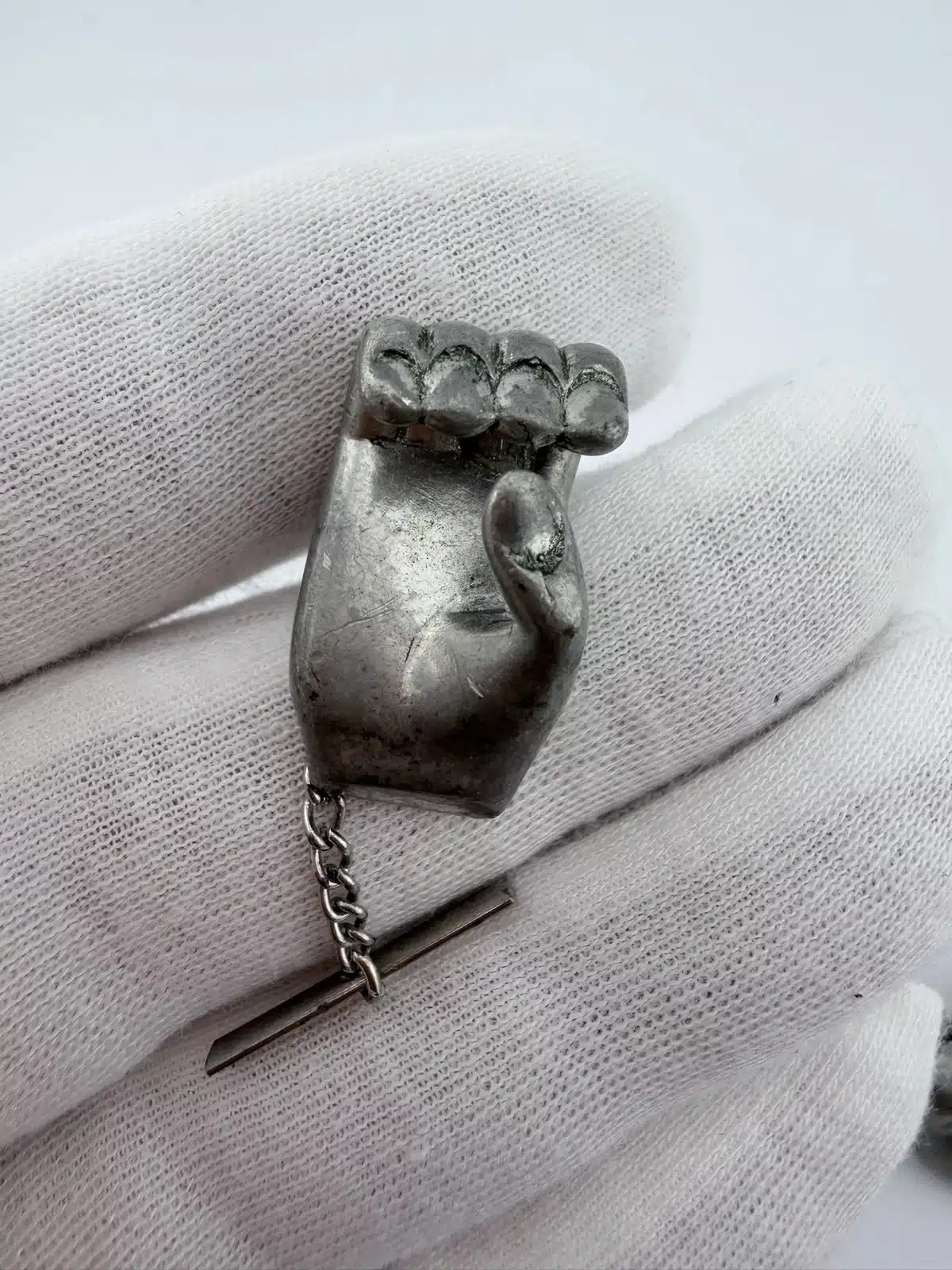 This set of two tie tack pins features grey-toned hands, one resembling a woman’s and the other a man’s, each possibly forming the letter ‘C’ in American Sign Language (ASL). The design captures the essence of communication through sign language, making it a notable representation of inclusivity and expression. Both pins could possibly hold a ribbon as well, unsure on the original purpose.