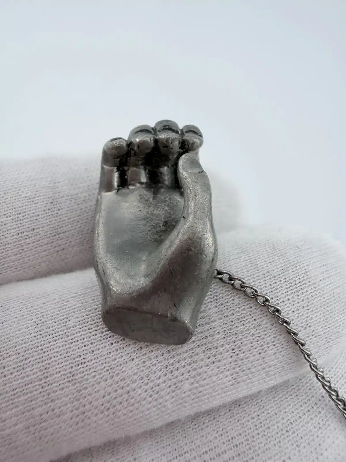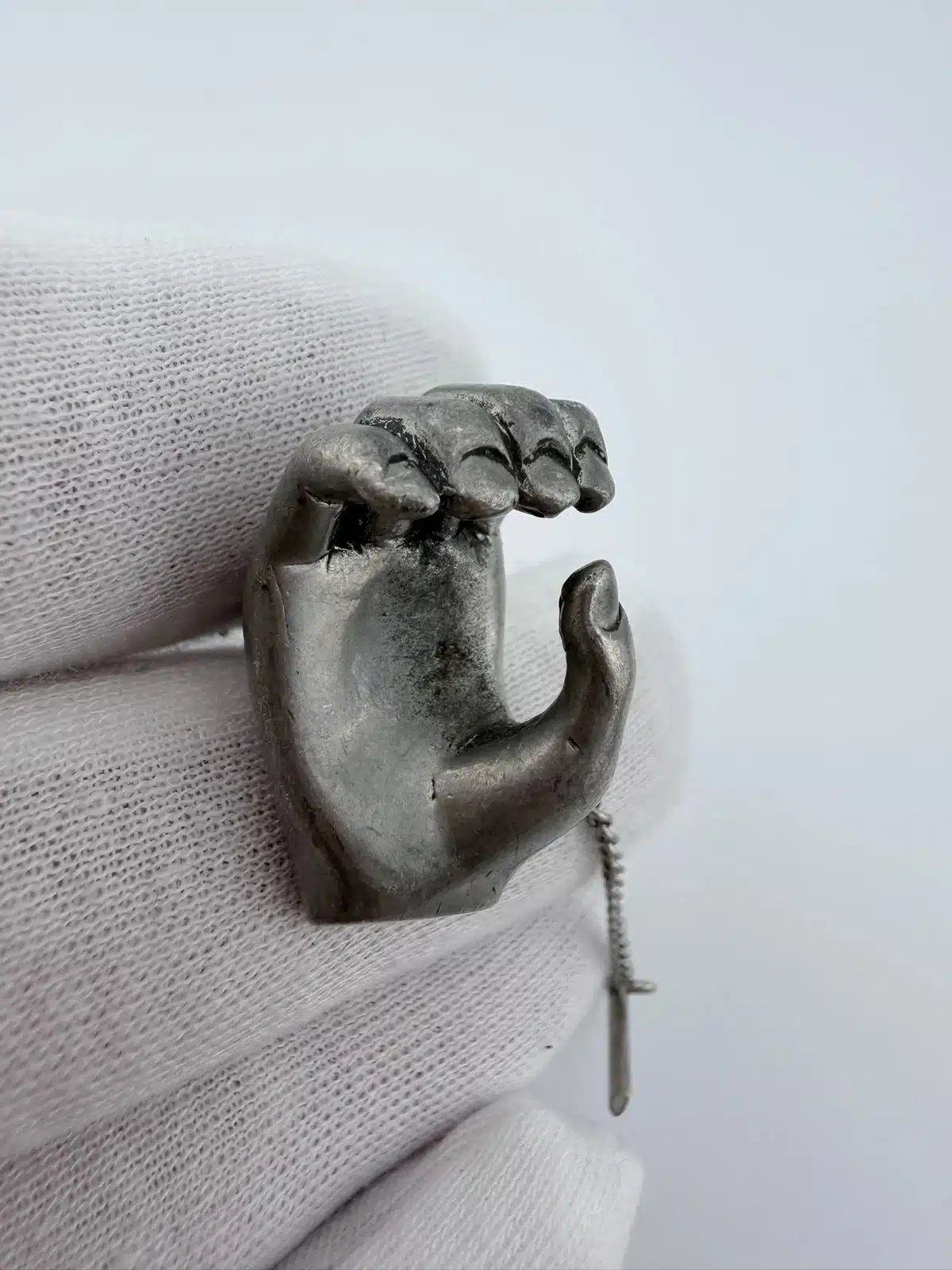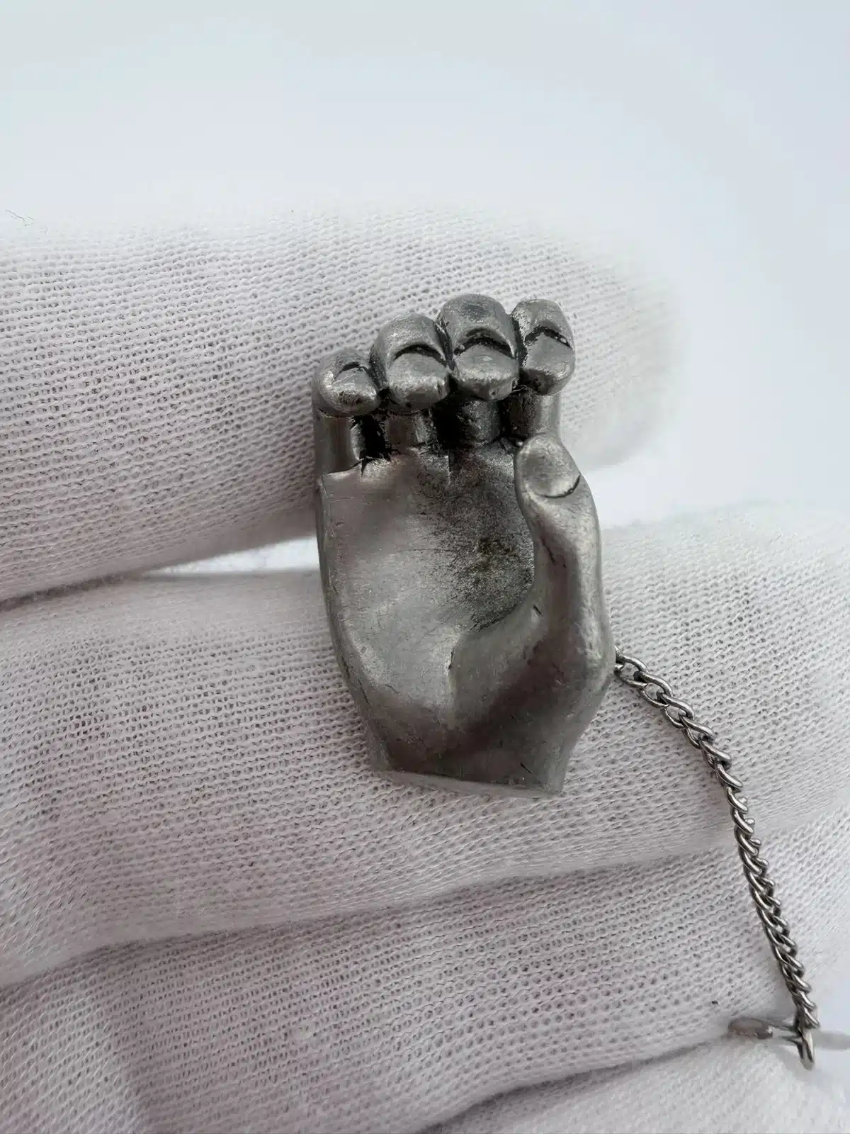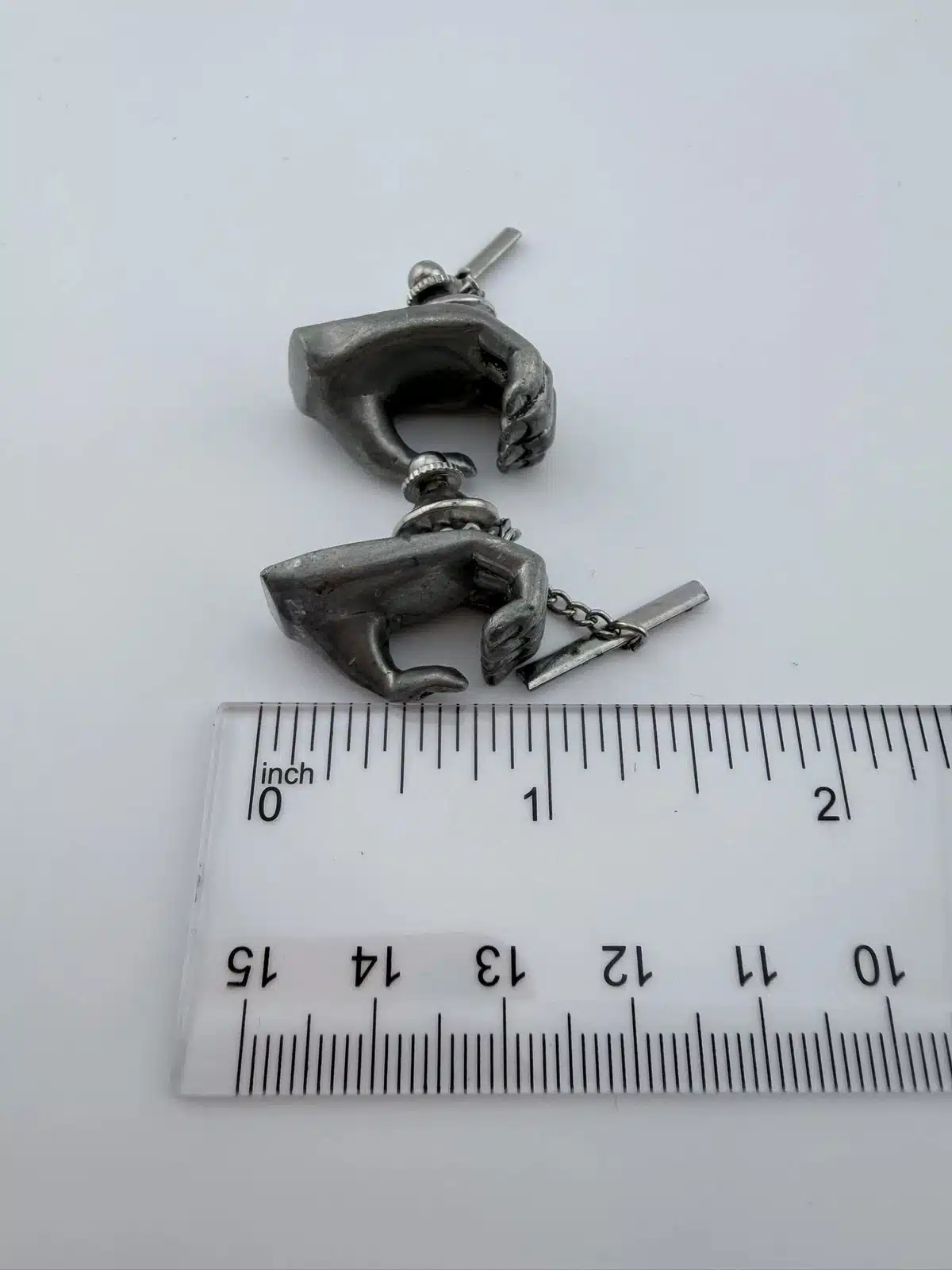 This set of two tie tack pins features grey-toned hands, one resembling a woman’s and the other a man’s, each possibly forming the letter ‘C’ in American Sign Language (ASL). The design captures the essence of communication through sign language, making it a notable representation of inclusivity and expression. Both pins could possibly hold a ribbon as well, unsure on the original purpose.
