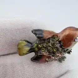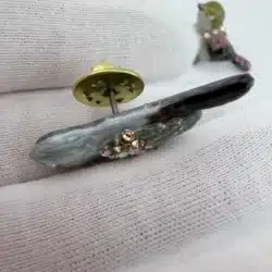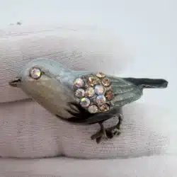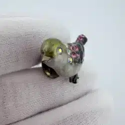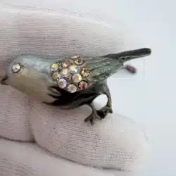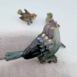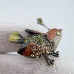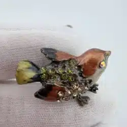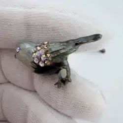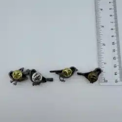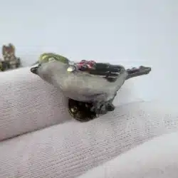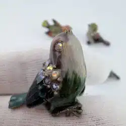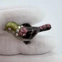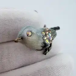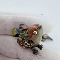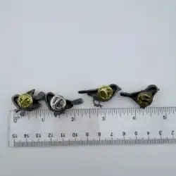 This set of 4 small bird lapel pins showcases intricate 3D designs, each uniquely adorned with colorful rhinestones that enhance their visual appeal. The variety of birds reflects a charming celebration of avian beauty and diversity. Each pin is approximately 1″ in width and 3/4″ in height.
