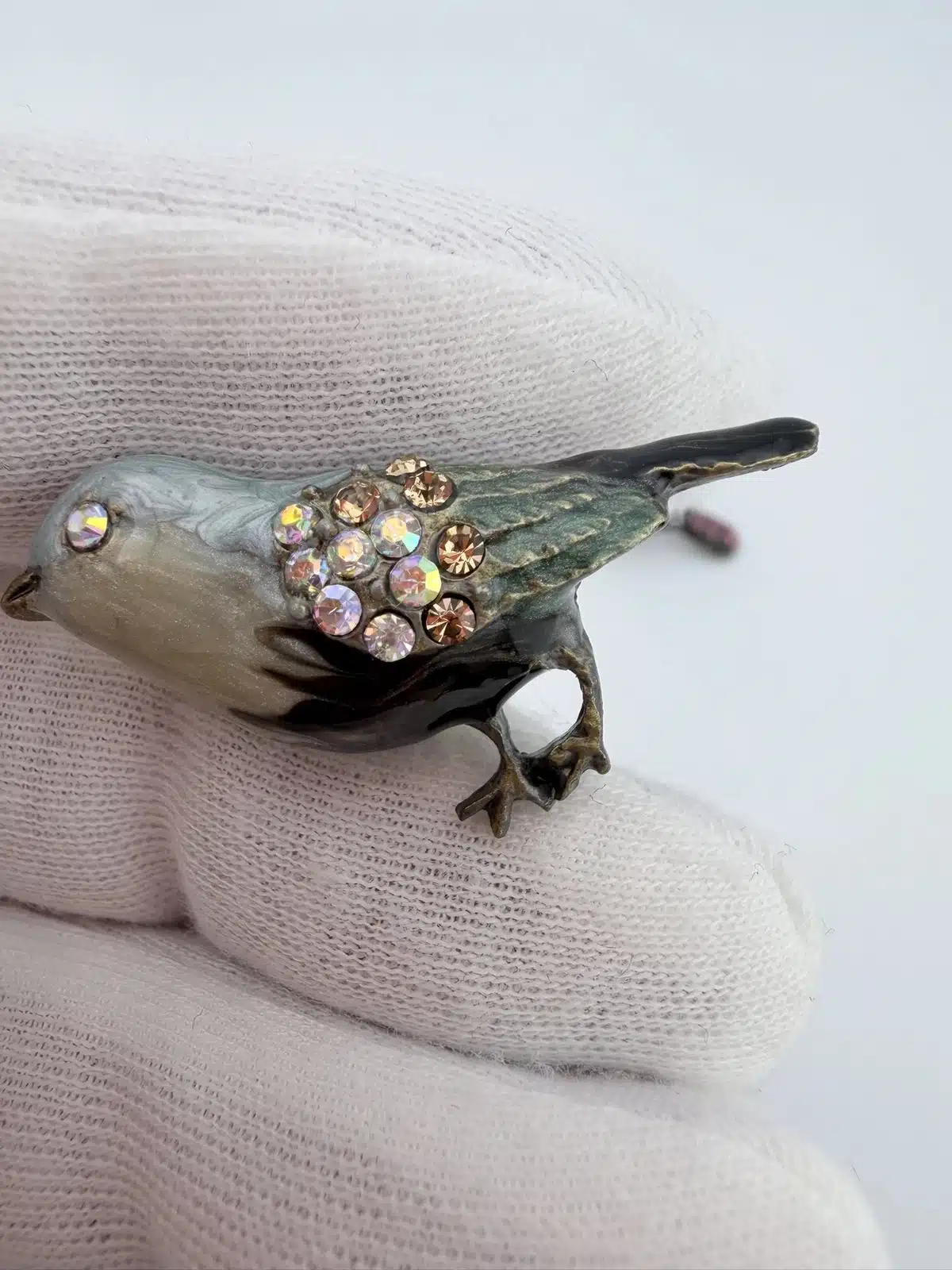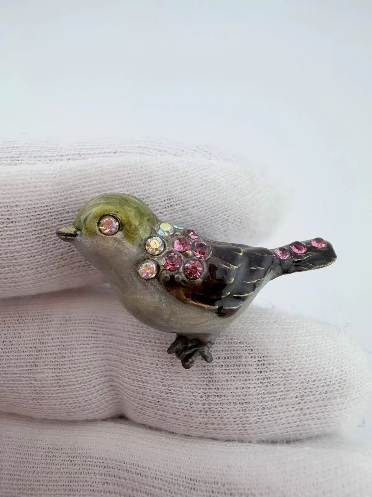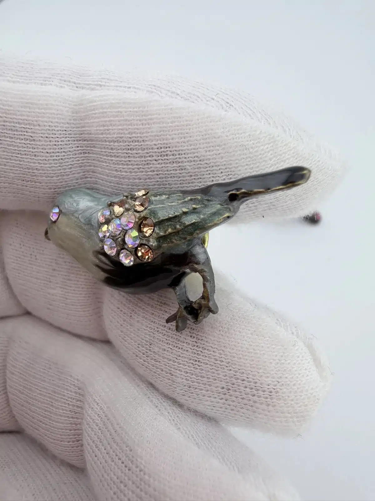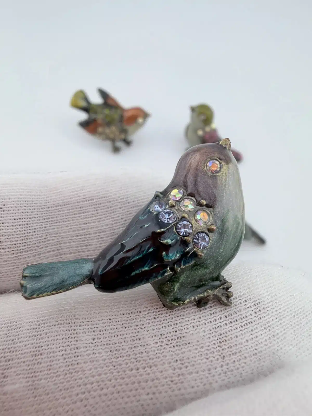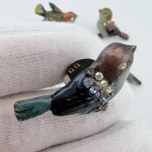 This set of 4 small bird lapel pins showcases intricate 3D designs, each uniquely adorned with colorful rhinestones that enhance their visual appeal. The variety of birds reflects a charming celebration of avian beauty and diversity. Each pin is approximately 1″ in width and 3/4″ in height.