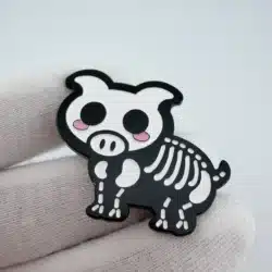 This Skeleton Pig Pin from Bone Pets features a charming depiction of a pig with a playful skeletal design, showcasing intricate detailing that highlights its whimsical nature. Bone Pets is known for its unique take on animal-themed collectibles, making this pin a standout piece in any collection.