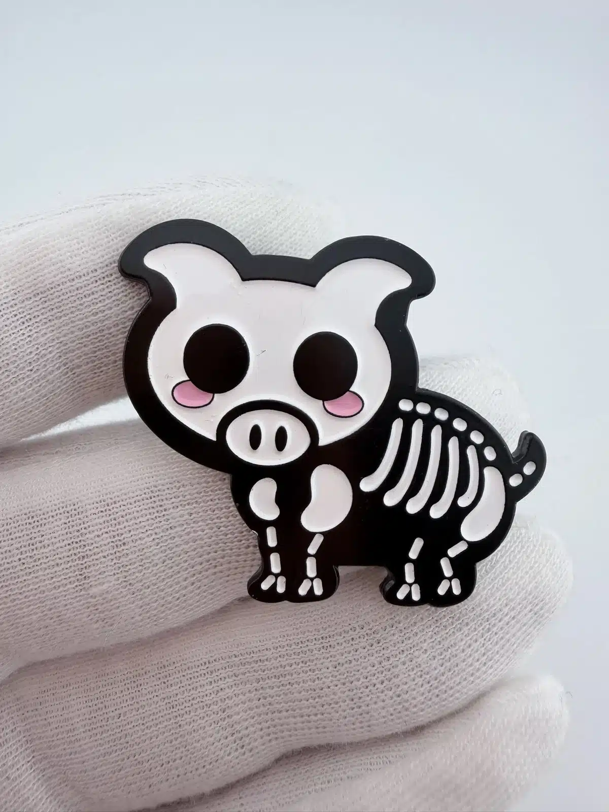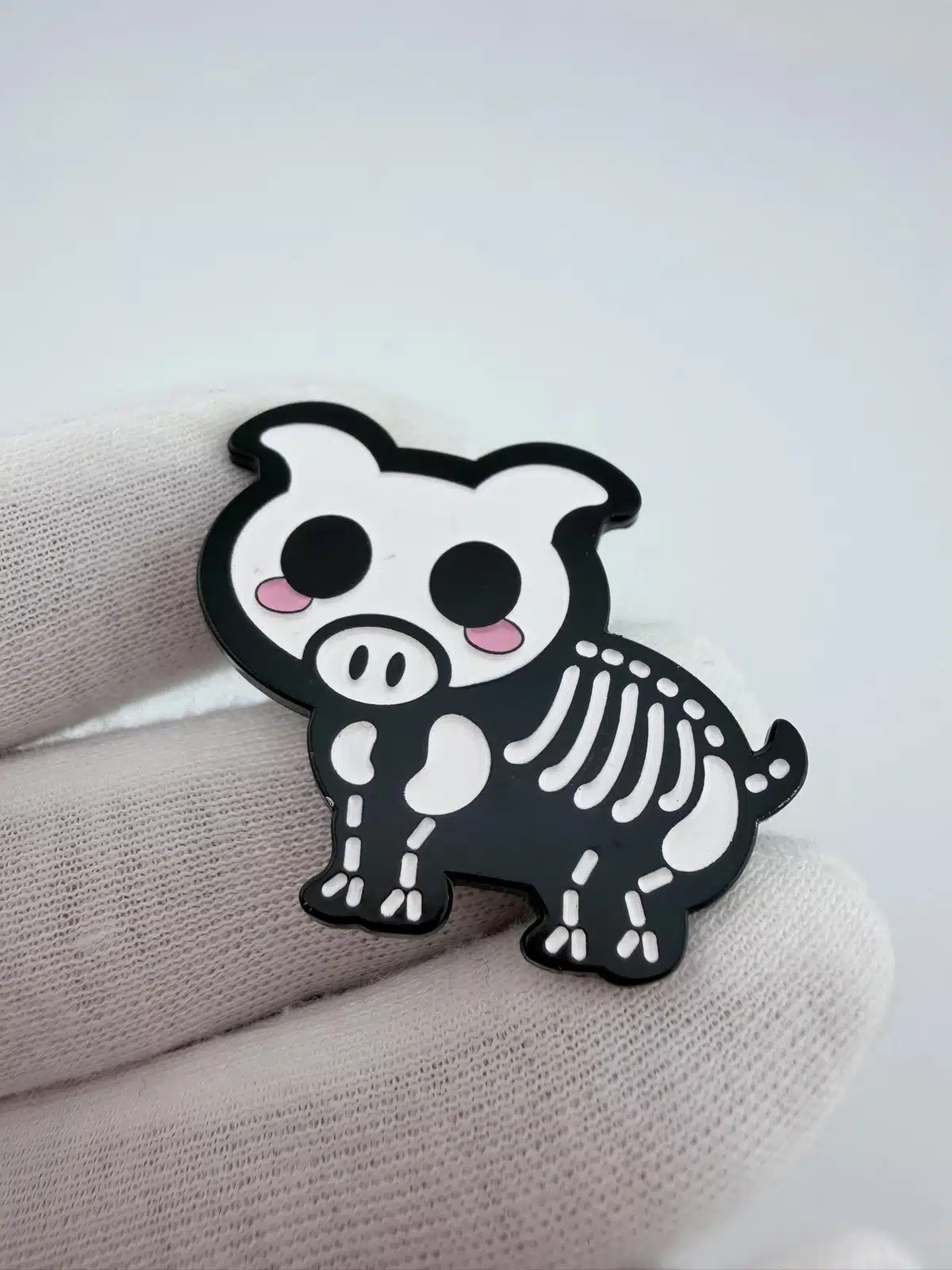 This Skeleton Pig Pin from Bone Pets features a charming depiction of a pig with a playful skeletal design, showcasing intricate detailing that highlights its whimsical nature. Bone Pets is known for its unique take on animal-themed collectibles, making this pin a standout piece in any collection.