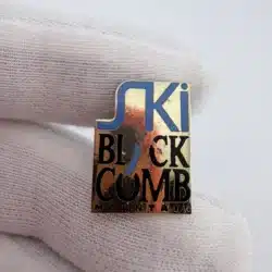 This pin features a simple text based design reading “Ski Blackcomb Mountain”. The word “Ski” appears in blue, and within the word “Blackcomb” the letter “A” is stylized in blue to resemble the side of a mountain. Pin measures approximately 1/2 inches in width by 3/4 inches in height.