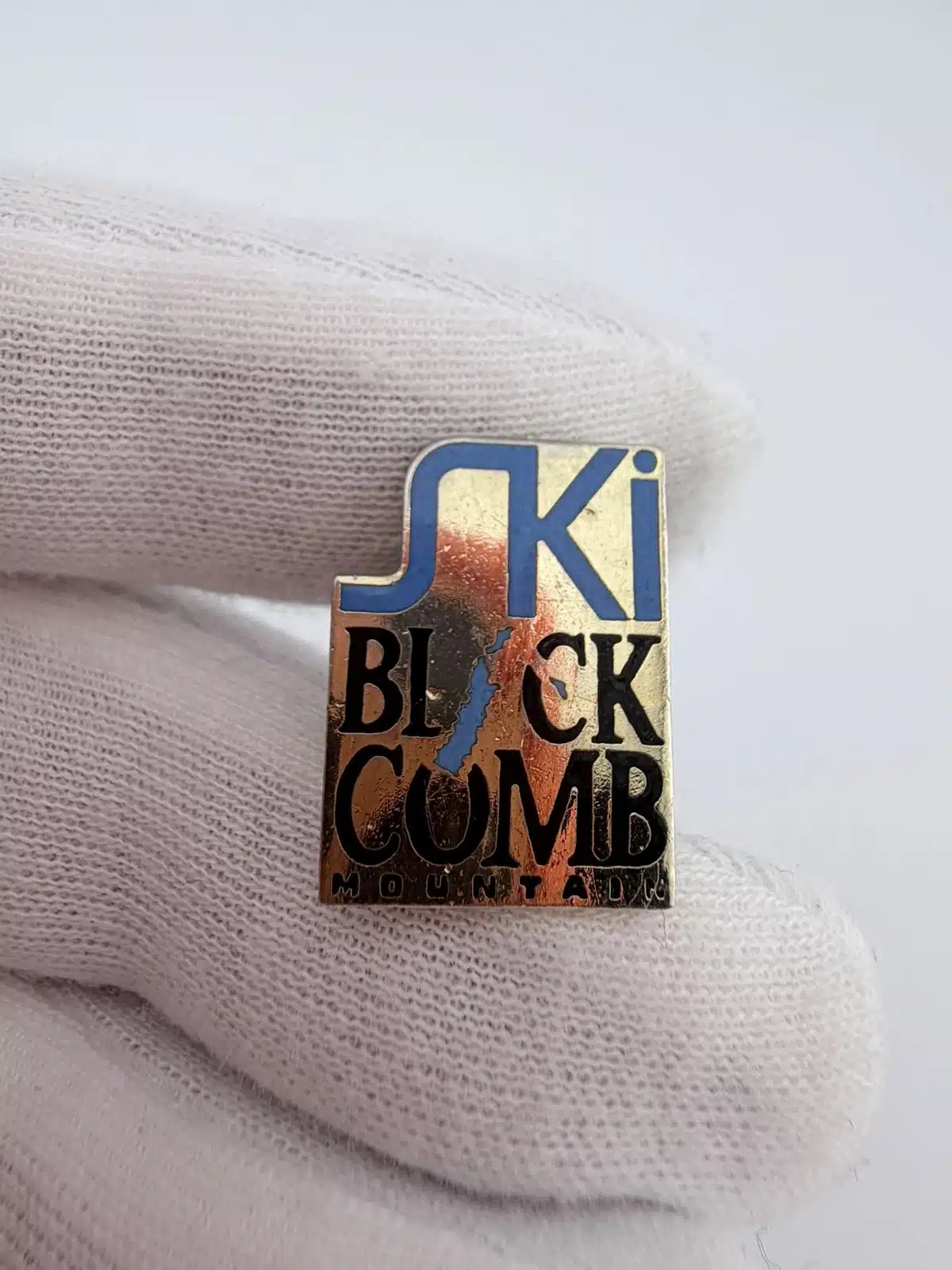 This pin features a simple text based design reading “Ski Blackcomb Mountain”. The word “Ski” appears in blue, and within the word “Blackcomb” the letter “A” is stylized in blue to resemble the side of a mountain. Pin measures approximately 1/2 inches in width by 3/4 inches in height.