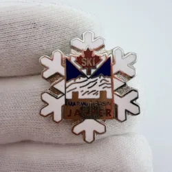 This pin is shaped like a snowflake with a symmetrical design. At the top is a red maple leaf containing the word “Ski,” and below it reads “Marmot Basin Jasper.”
