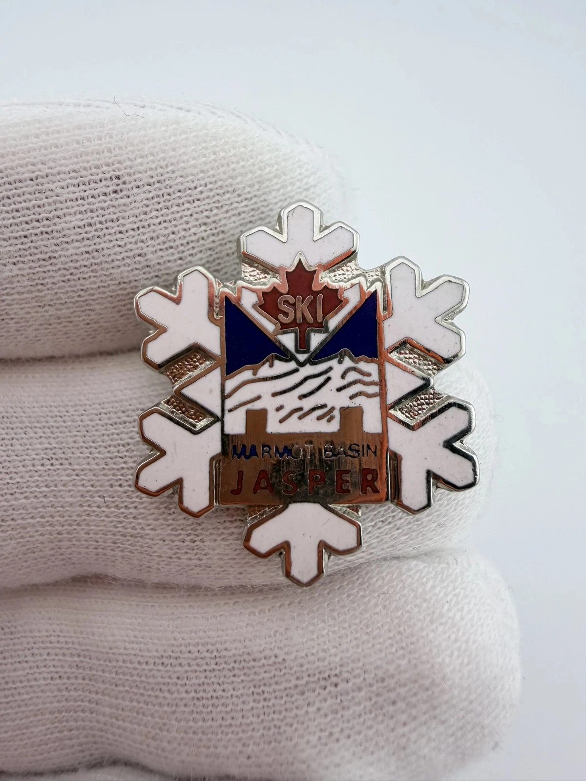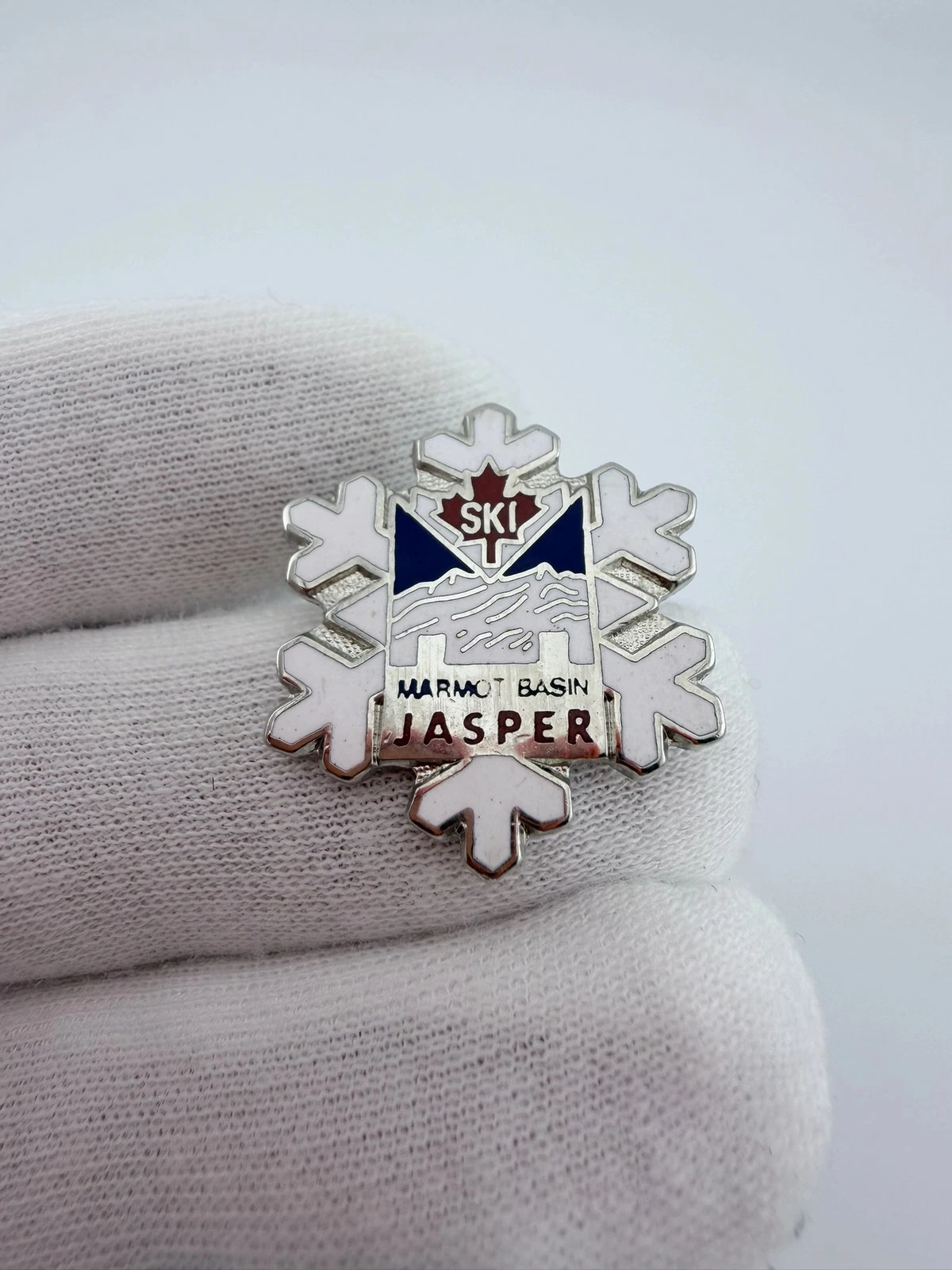 This pin is shaped like a snowflake with a symmetrical design. At the top is a red maple leaf containing the word “Ski,” and below it reads “Marmot Basin Jasper.”