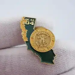 This lapel pin is shaped like the state of California, prominently displaying the SMW emblem along with ‘Local 104′ in the top left corner. It serves as a tribute to the Sheet Metal Workers’ union in California, reflecting both regional pride and organizational identity.