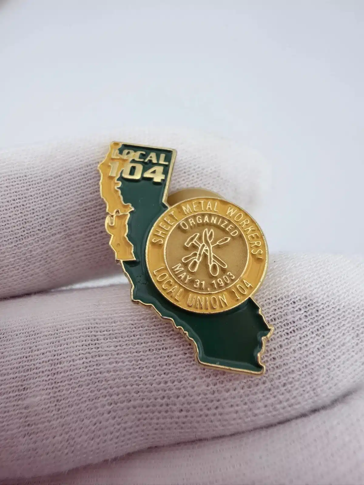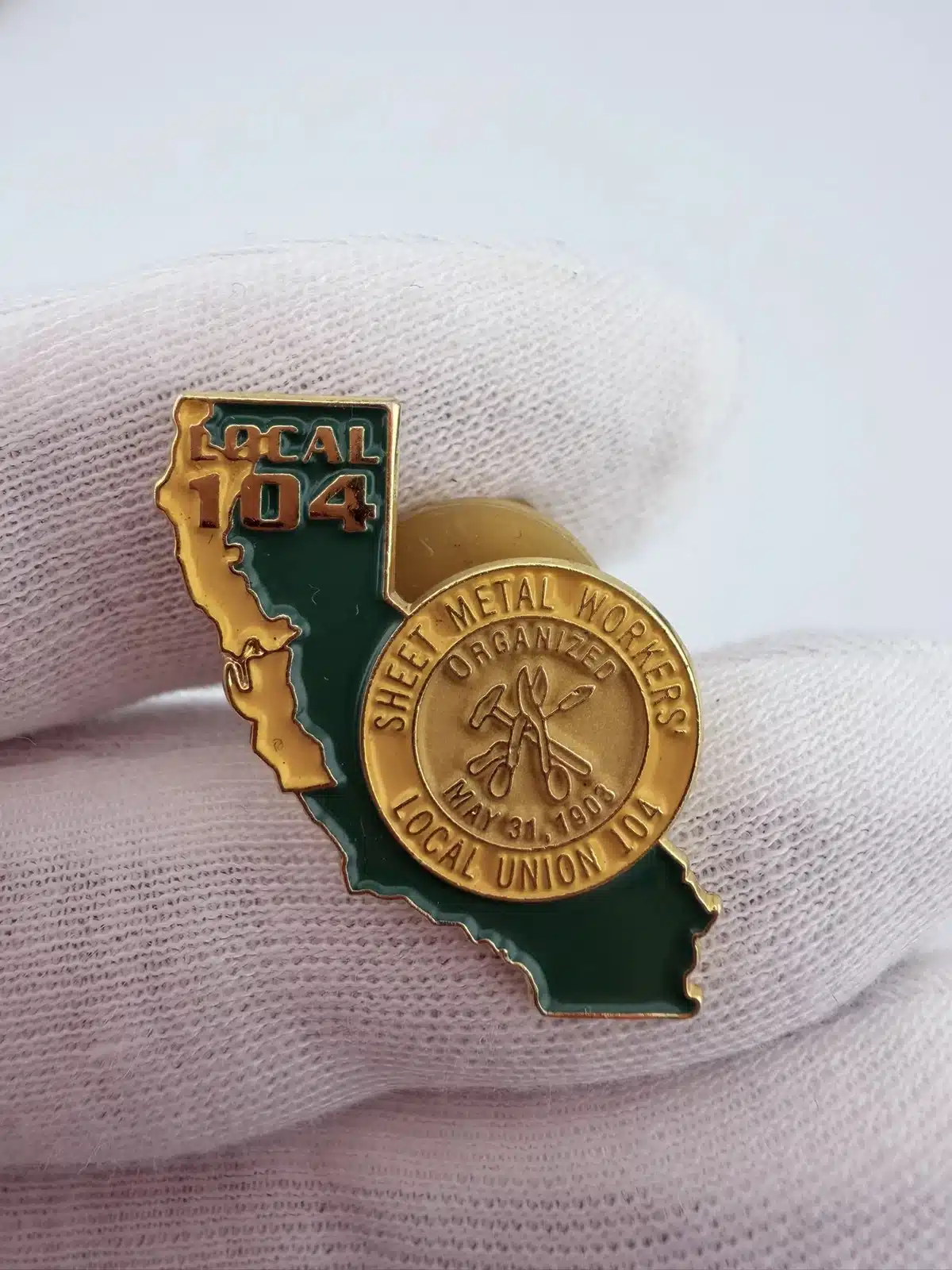 This lapel pin is shaped like the state of California, prominently displaying the SMW emblem along with ‘Local 104′ in the top left corner. It serves as a tribute to the Sheet Metal Workers’ union in California, reflecting both regional pride and organizational identity.