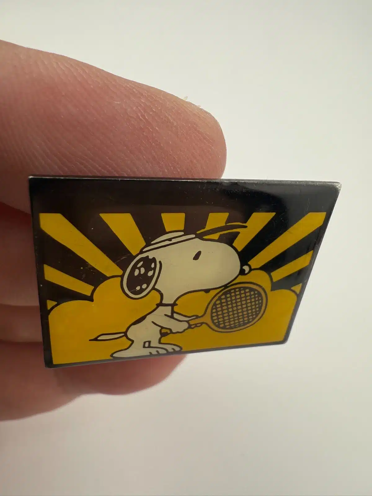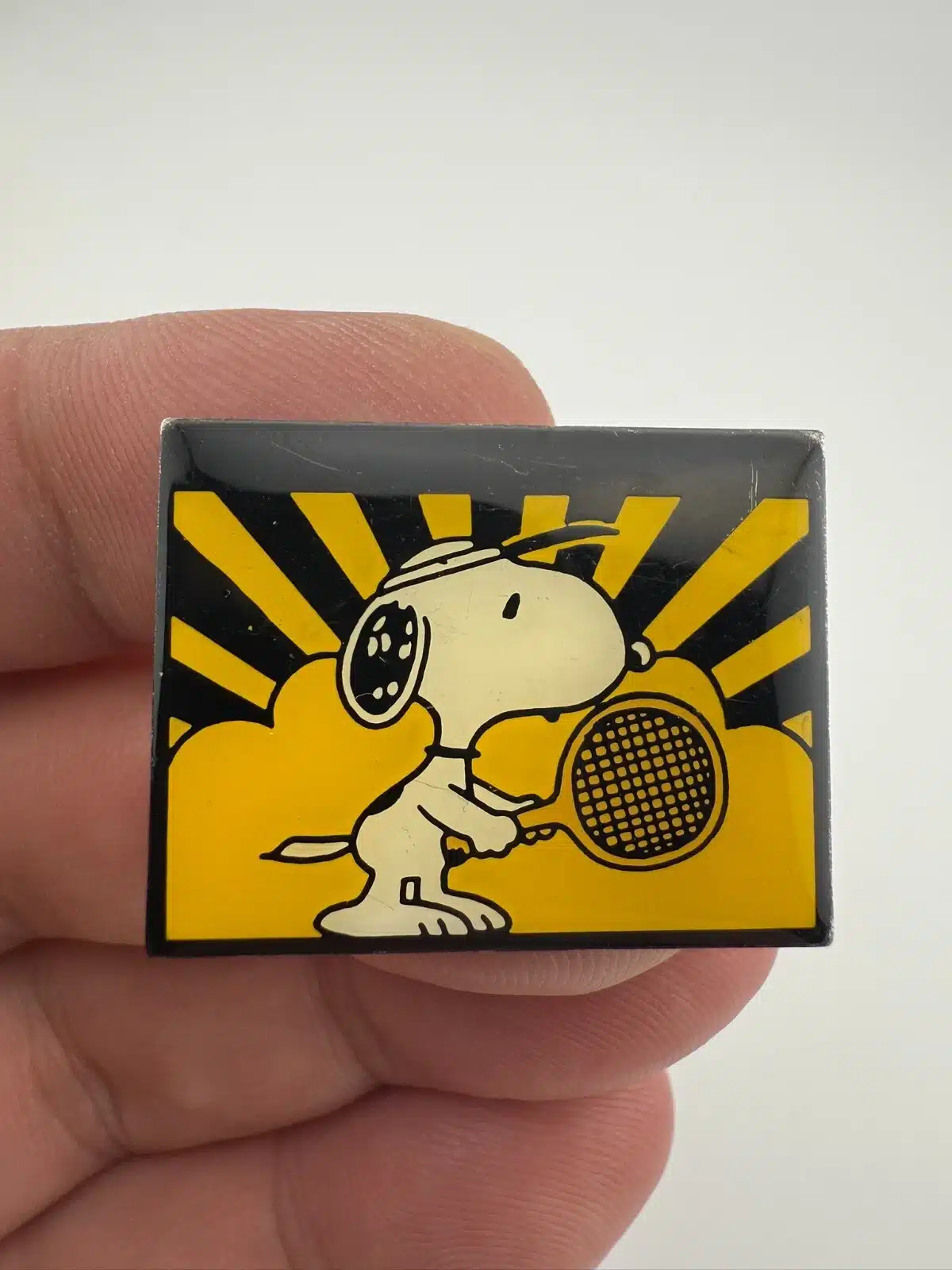 Snoopy Playing Tennis Lapel Pin – UFS INC / 1958 Stamped *scratch/scuff marks*