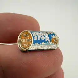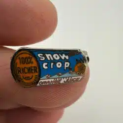 The Snow Crop Orange Juice brand pin is designed in the shape of a can of frozen concentrate, featuring the phrase ‘100% richer.’ This collectible piece likely dates back to the mid-20th century and is a unique representation of vintage food advertising.