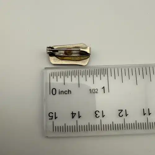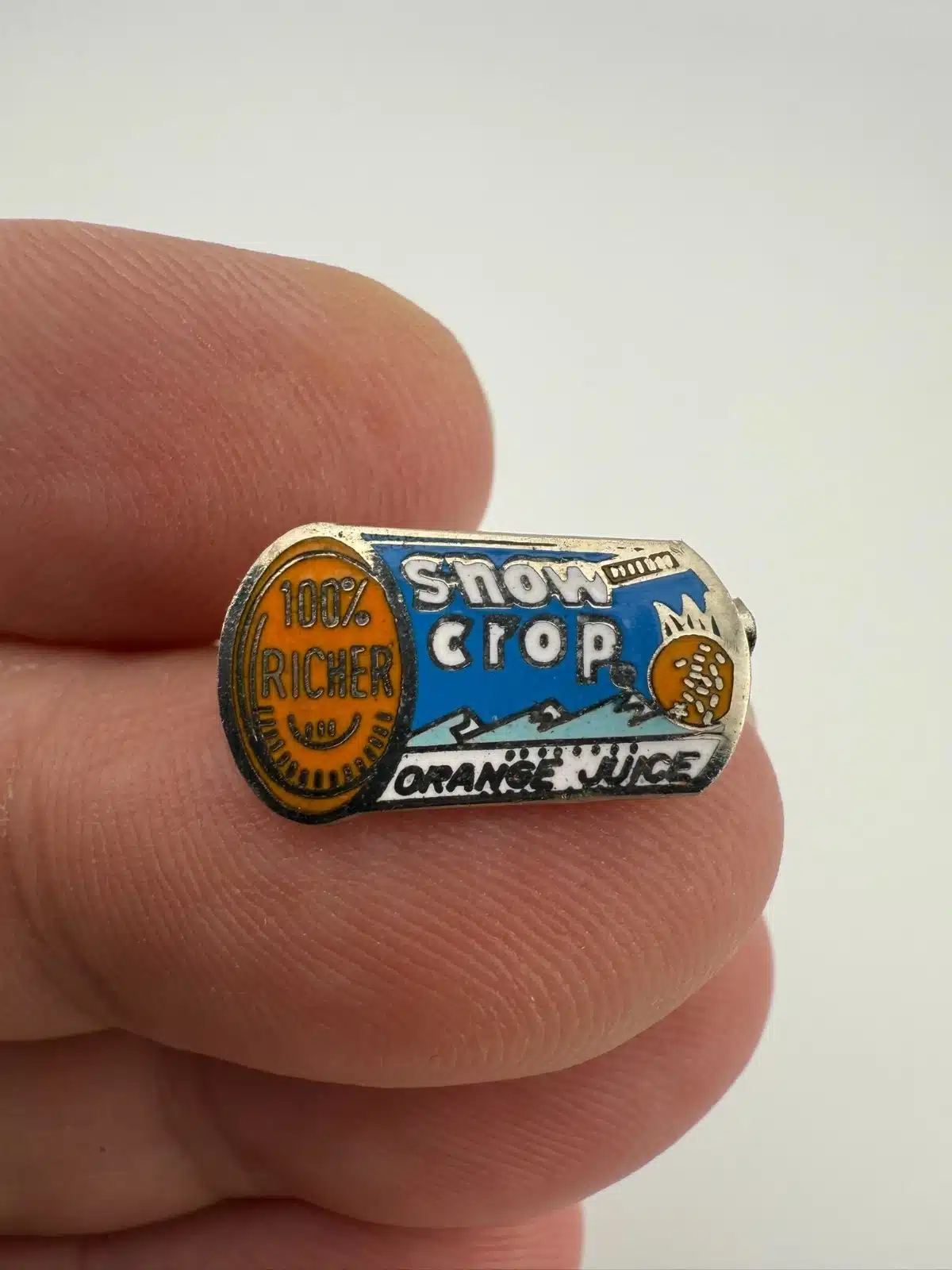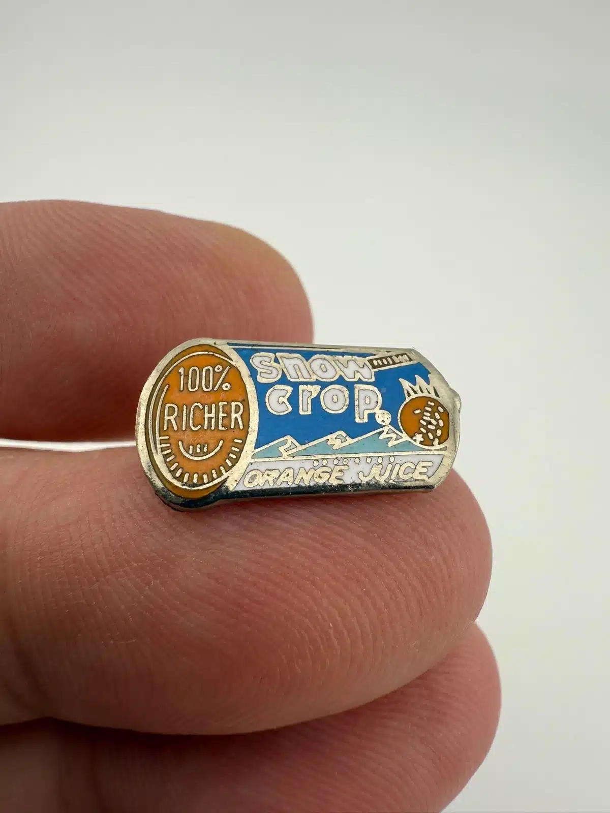 The Snow Crop Orange Juice brand pin is designed in the shape of a can of frozen concentrate, featuring the phrase ‘100% richer.’ This collectible piece likely dates back to the mid-20th century and is a unique representation of vintage food advertising.