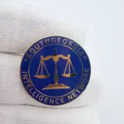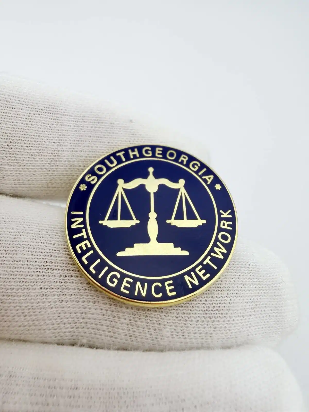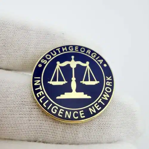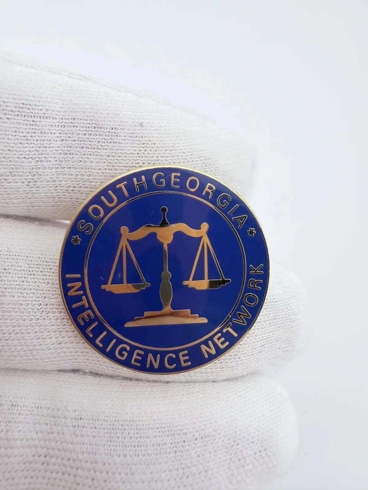 This dark blue enamel pin features the words ‘South Georgia Intelligence Network’ encircling the outer edge, emphasizing its connection to the region’s intelligence community. At the center, the scales of justice symbolize the commitment to law and order, reflecting the values upheld by the organization.