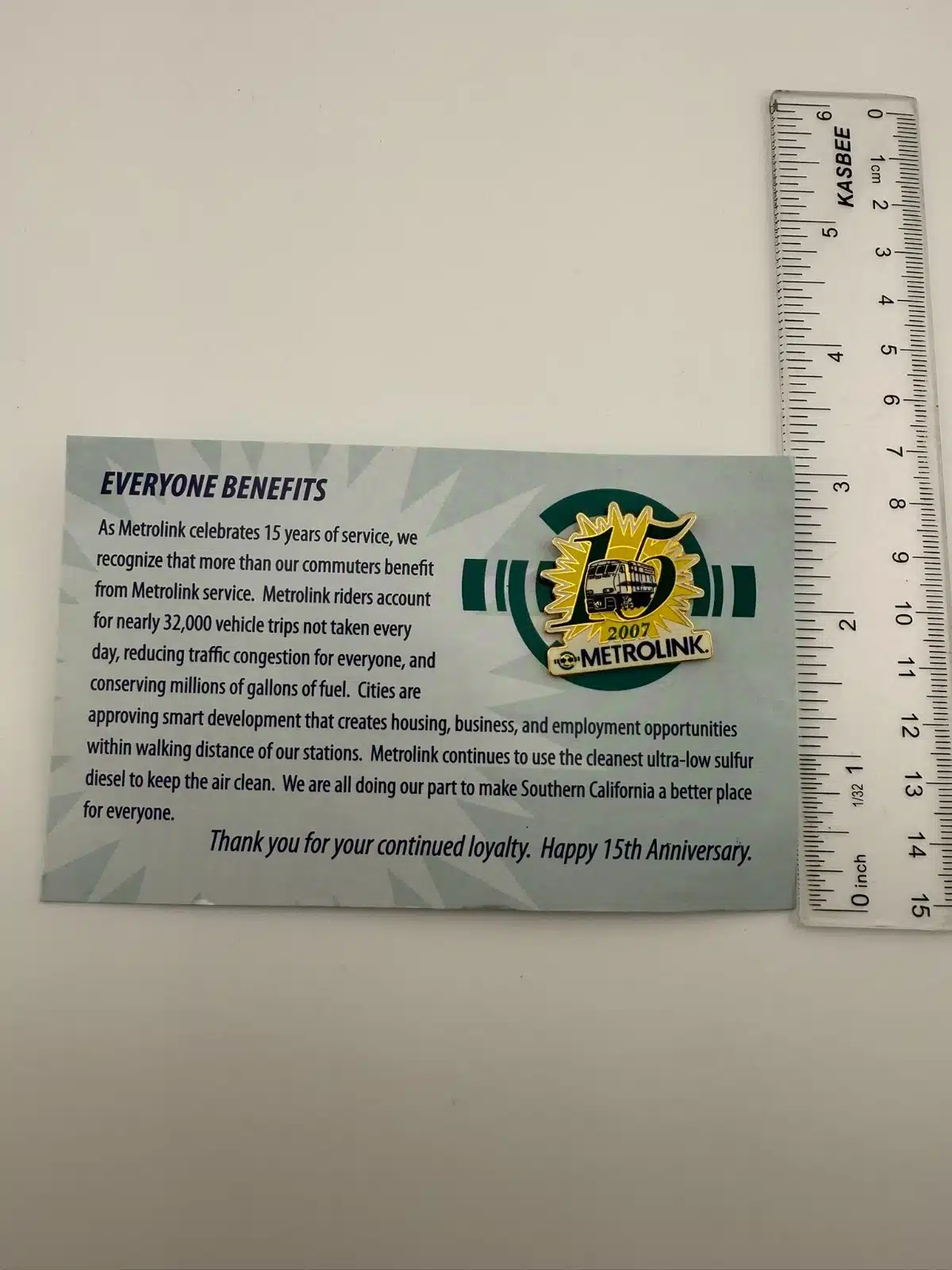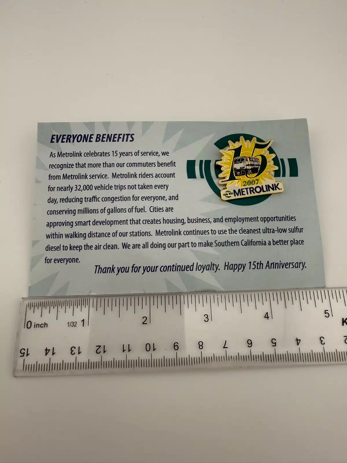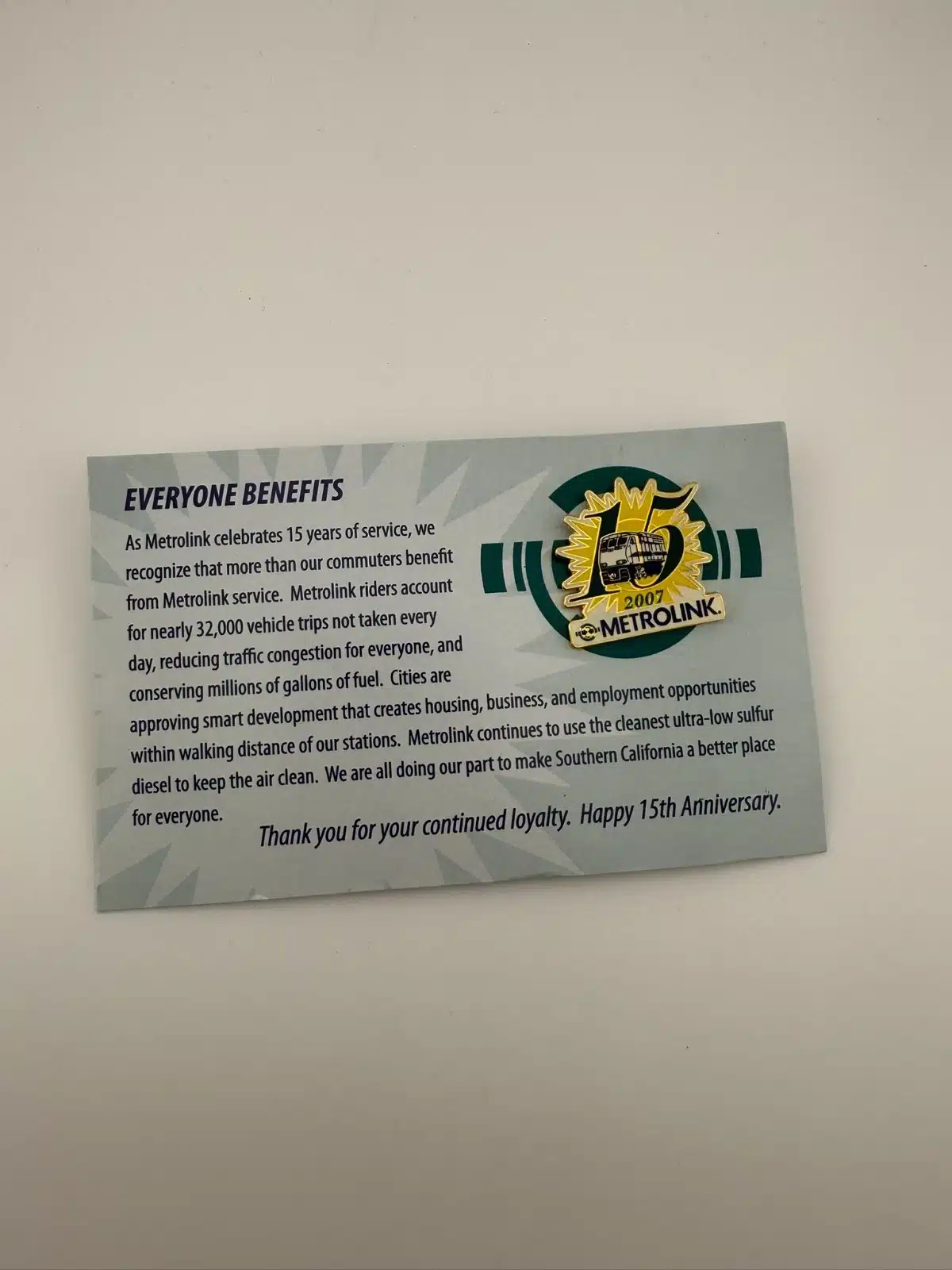 The Southern California Metrolink 15th Anniversary pin from 2007.