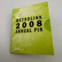 The 2008 Metrolink pin in its original pamphlet. This one features a unique circular track design that really stands out.