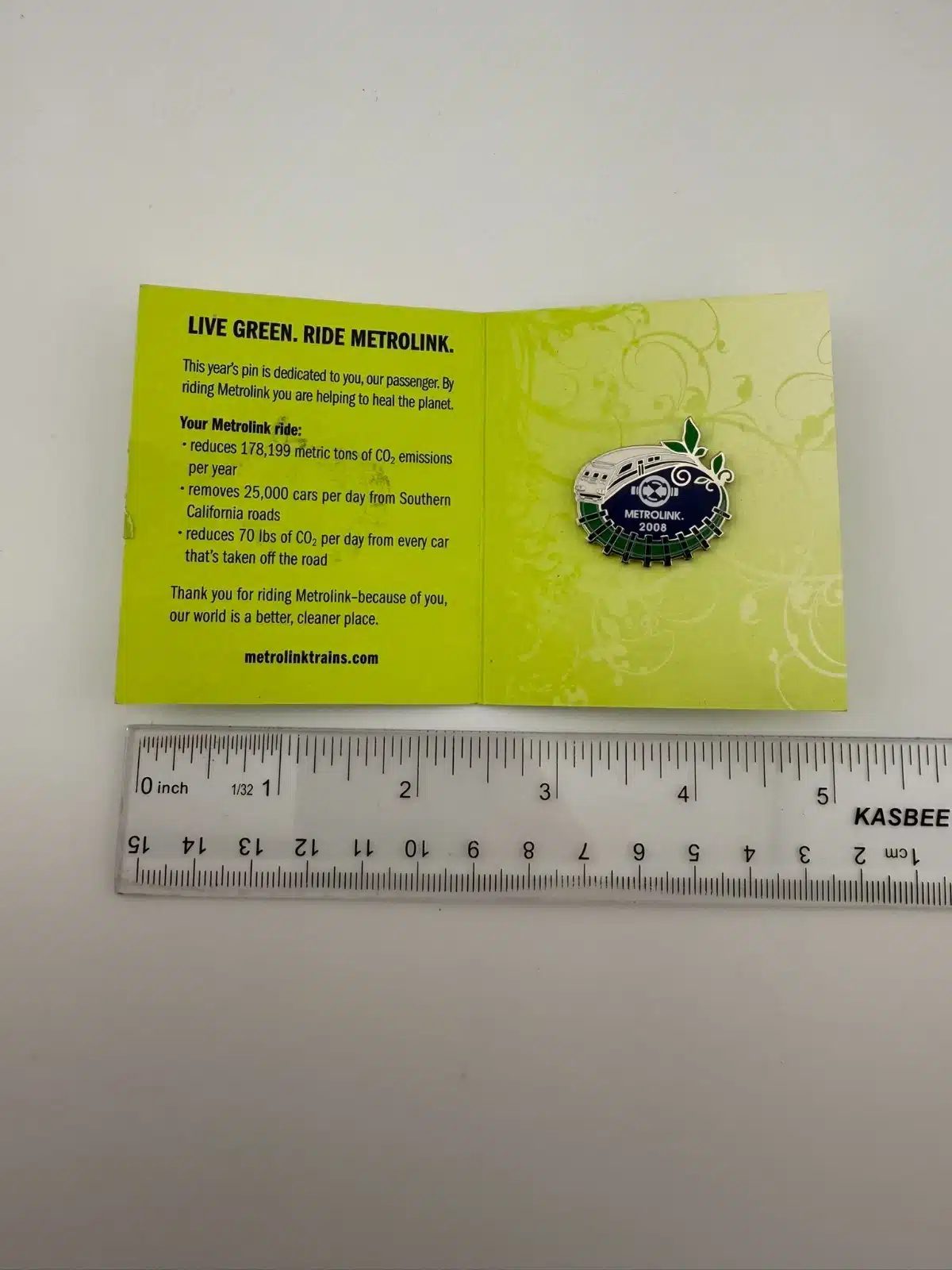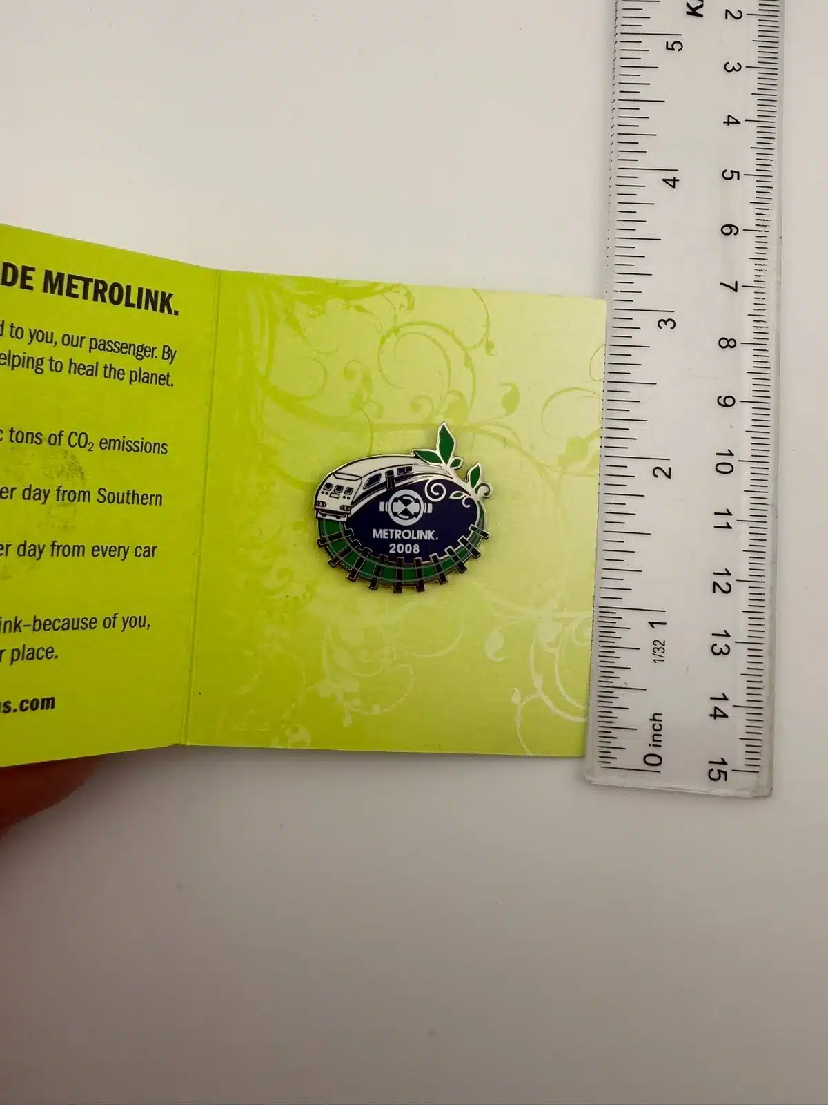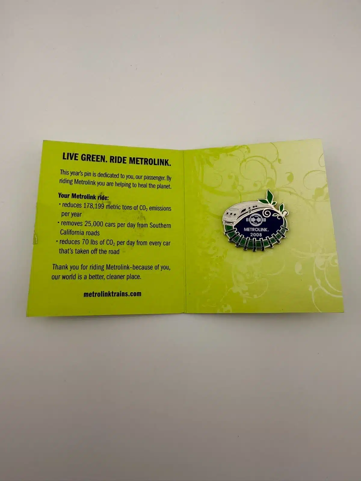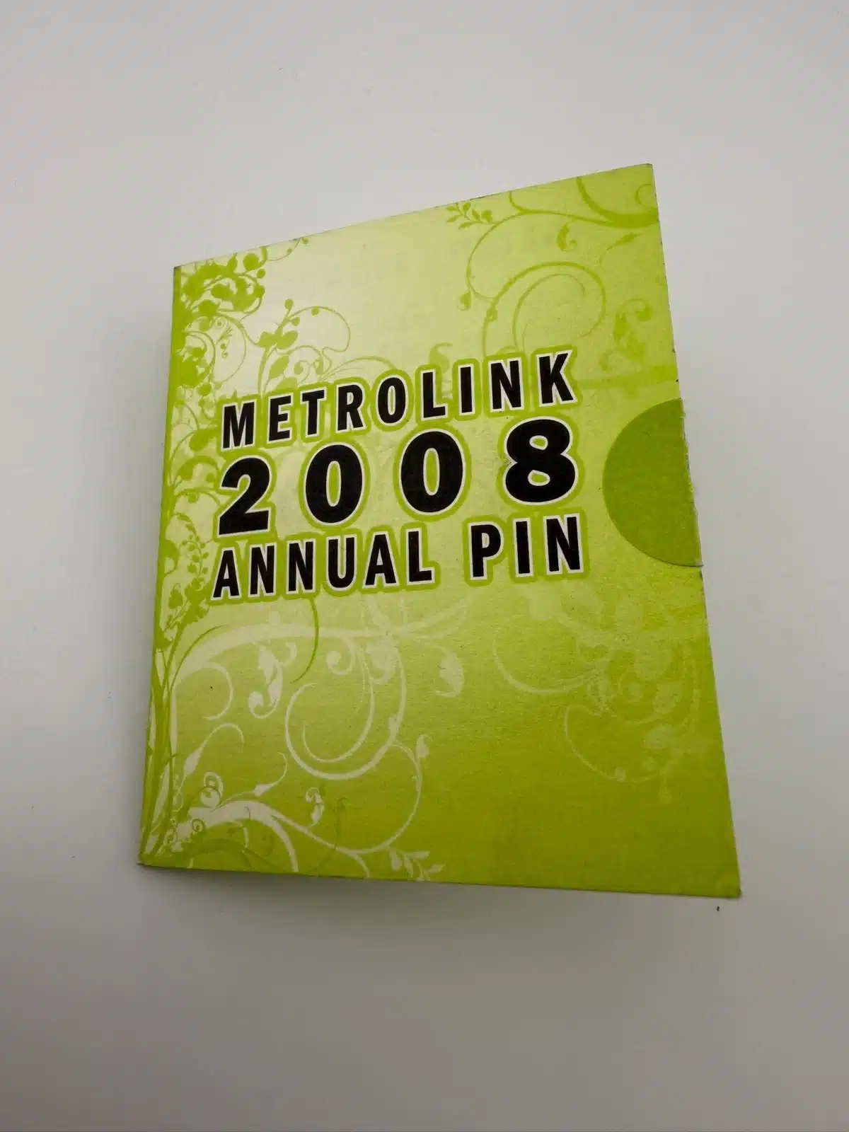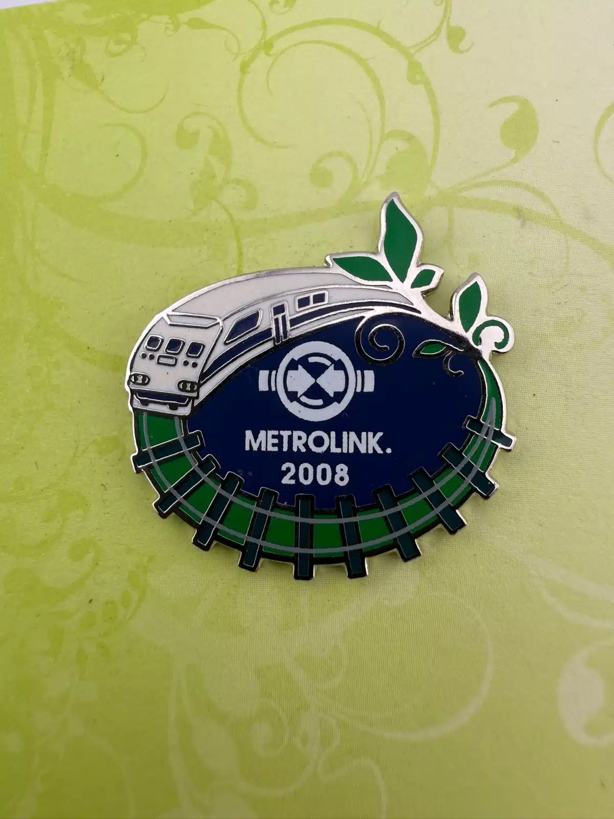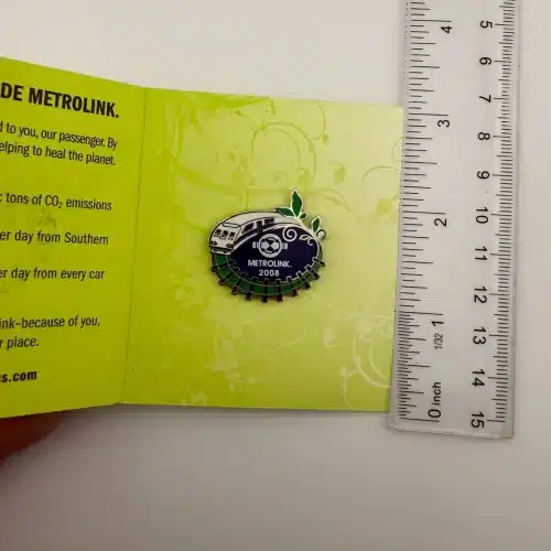 The 2008 Metrolink pin in its original pamphlet. This one features a unique circular track design that really stands out.