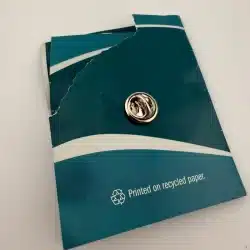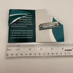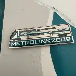 Southern California Metrolink 2009 train pin. The original pamphlet is included but damaged, though the pin itself still makes a great collectible for Metrolink pin collectors.