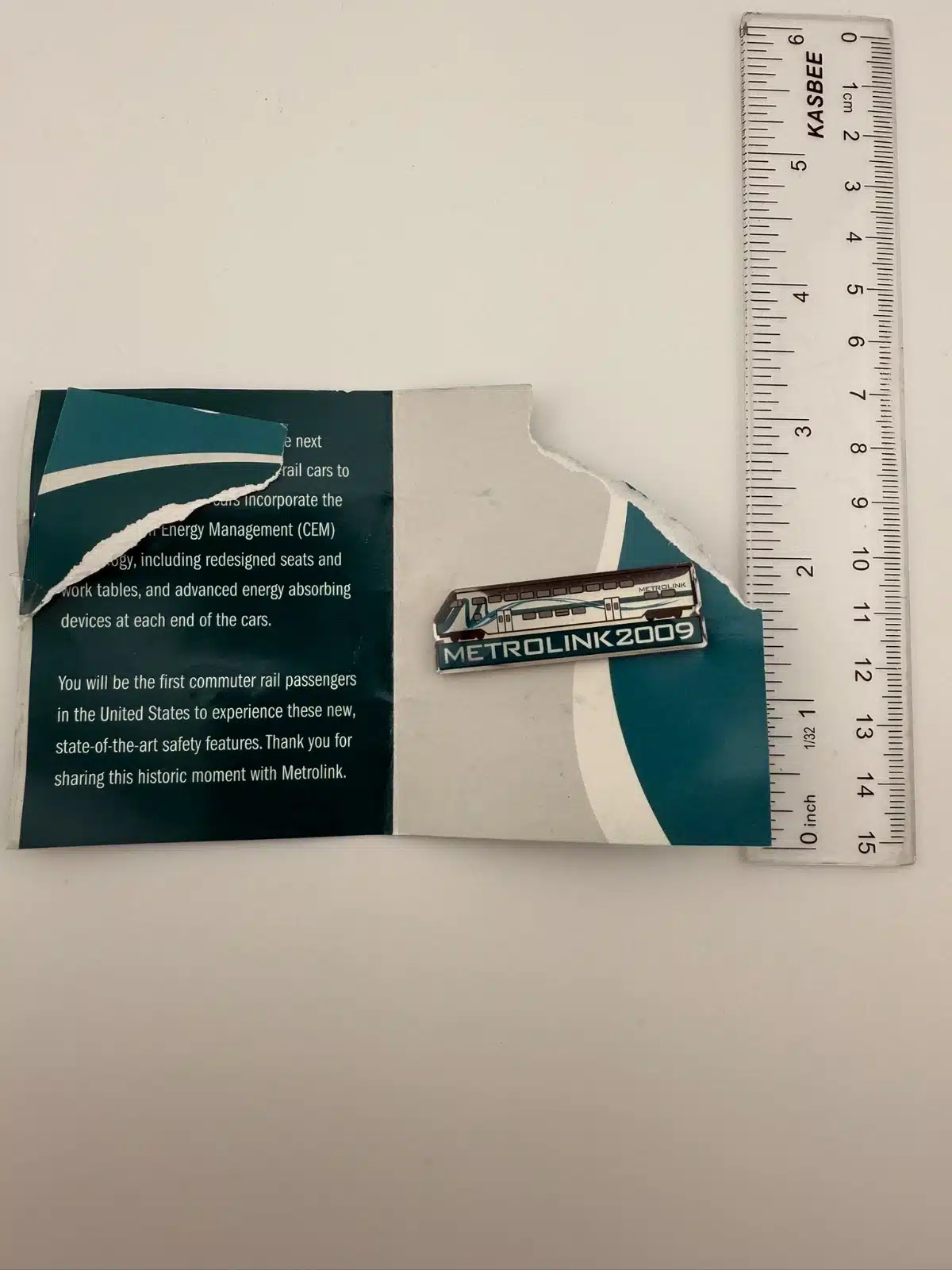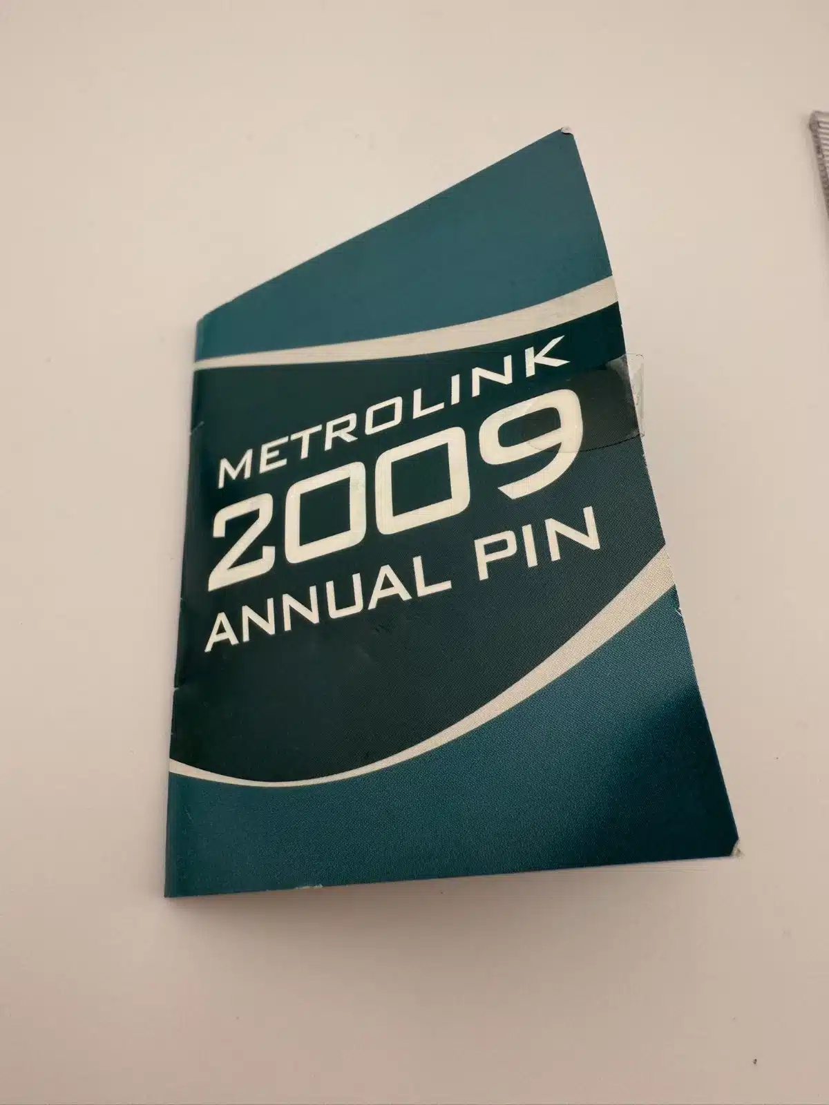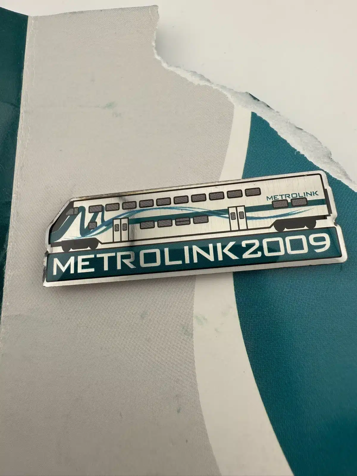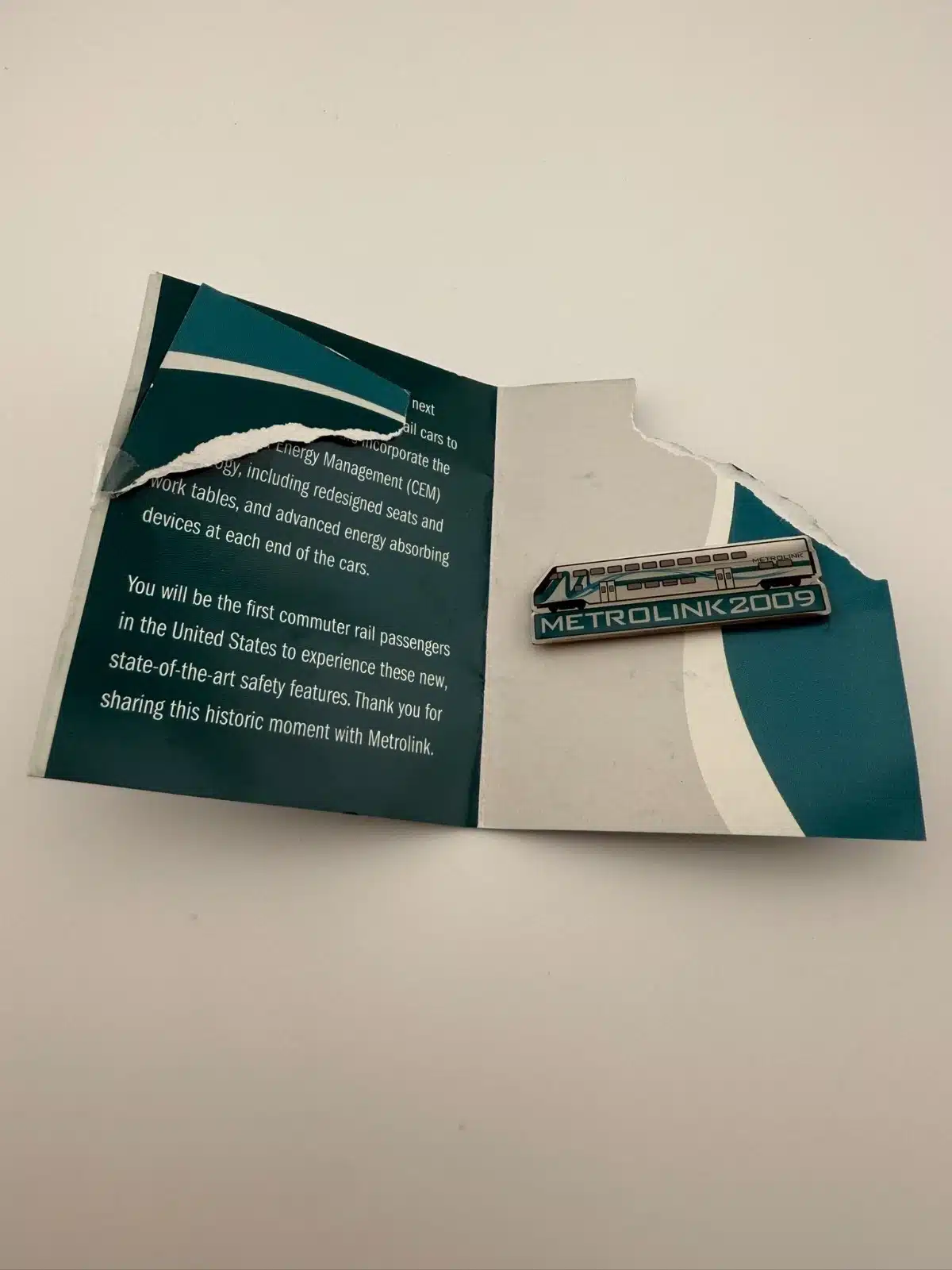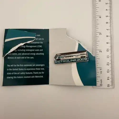 Southern California Metrolink 2009 train pin. The original pamphlet is included but damaged, though the pin itself still makes a great collectible for Metrolink pin collectors.