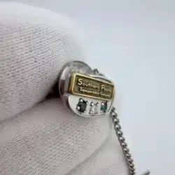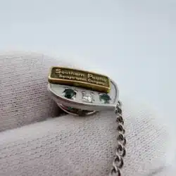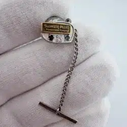 This Southern Pacific Transportation Company Employee Service Award pin features a silver tone base with a raised gold tone rectangular panel at the top left. Inside the rectangle, the words “Southern Pacific Transportation Company” are clearly displayed, creating a clean and distinguished presentation.