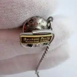 Below the nameplate are two green stones and one clear stone. The combination of silver and gold tone finishes with the colored accents gives the piece a classic employee recognition appearance.
