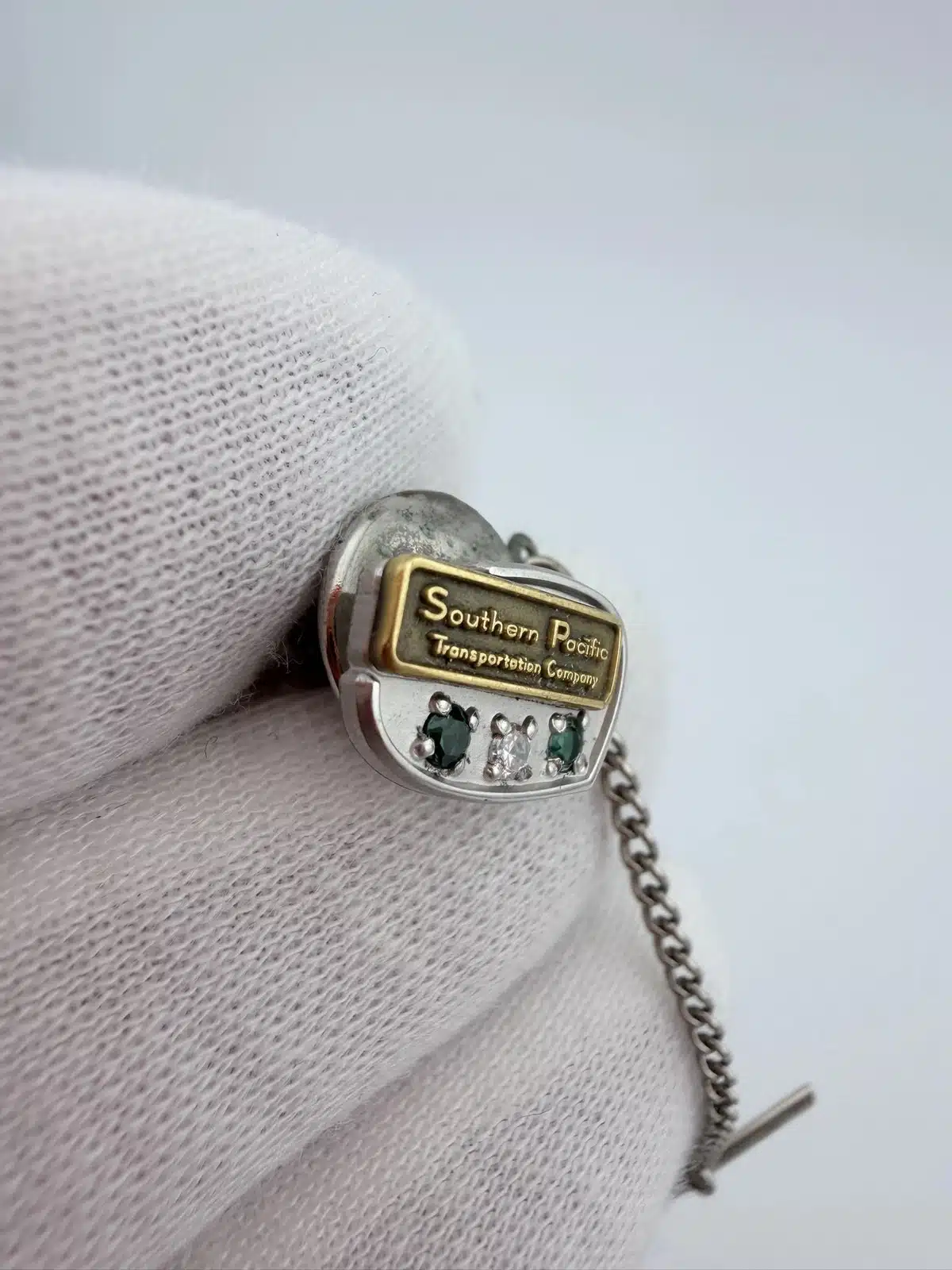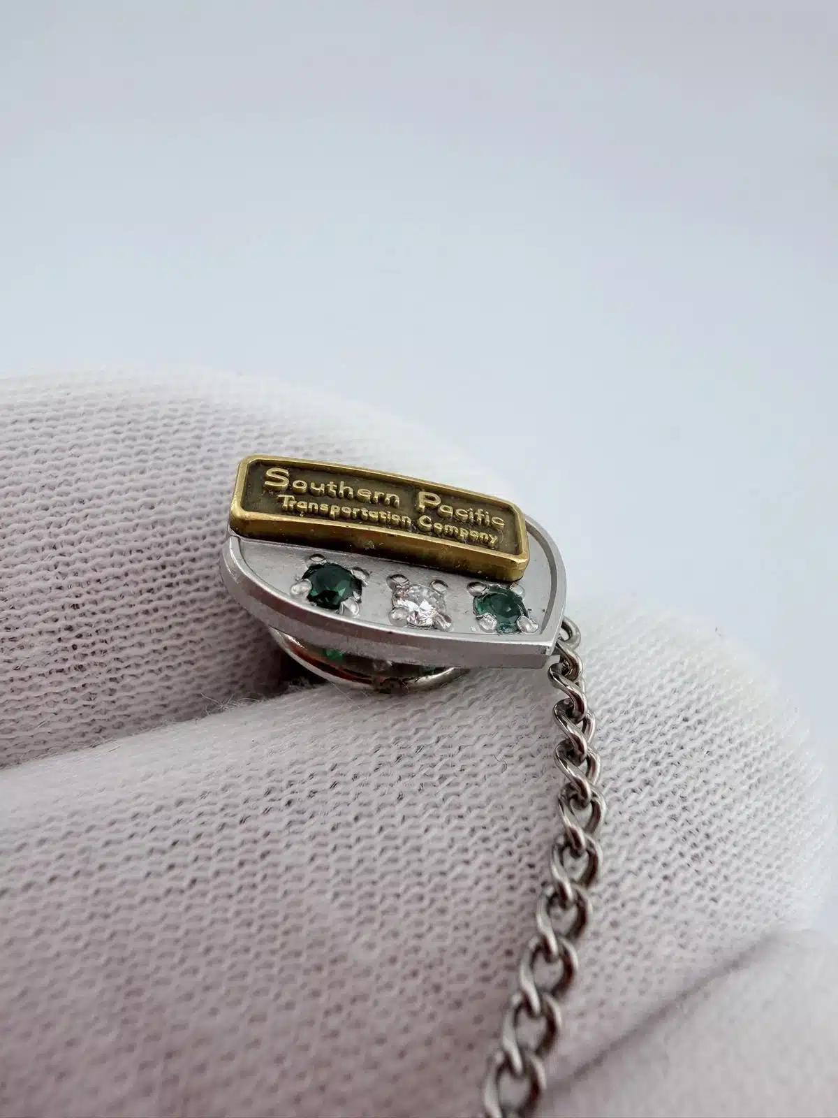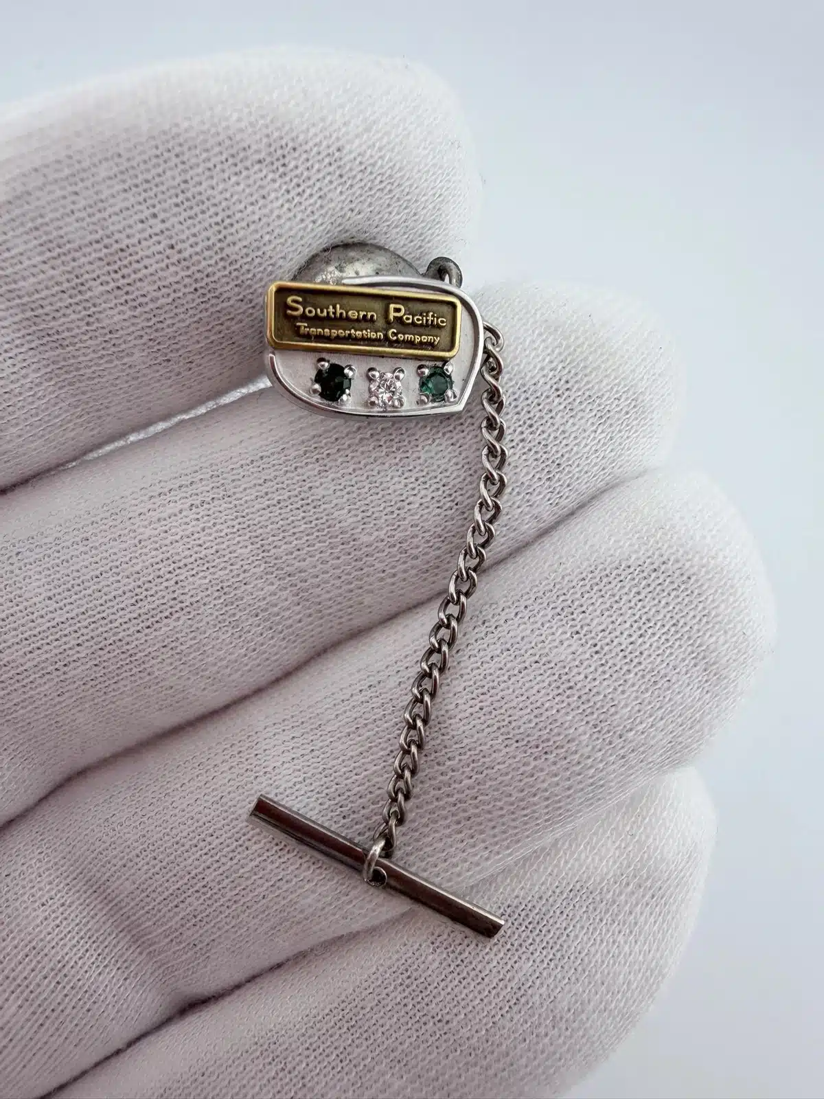 This Southern Pacific Transportation Company Employee Service Award pin features a silver tone base with a raised gold tone rectangular panel at the top left. Inside the rectangle, the words “Southern Pacific Transportation Company” are clearly displayed, creating a clean and distinguished presentation.