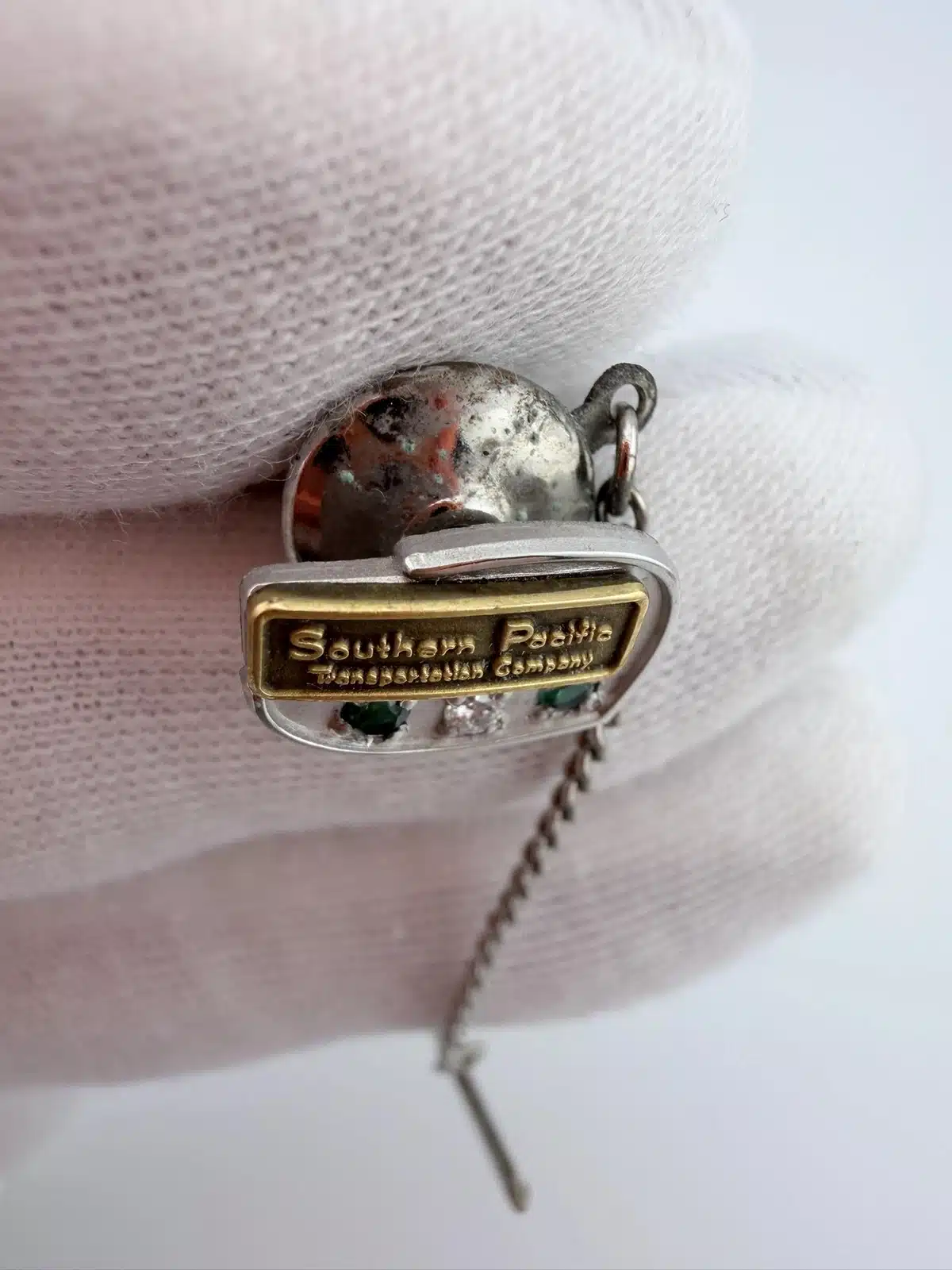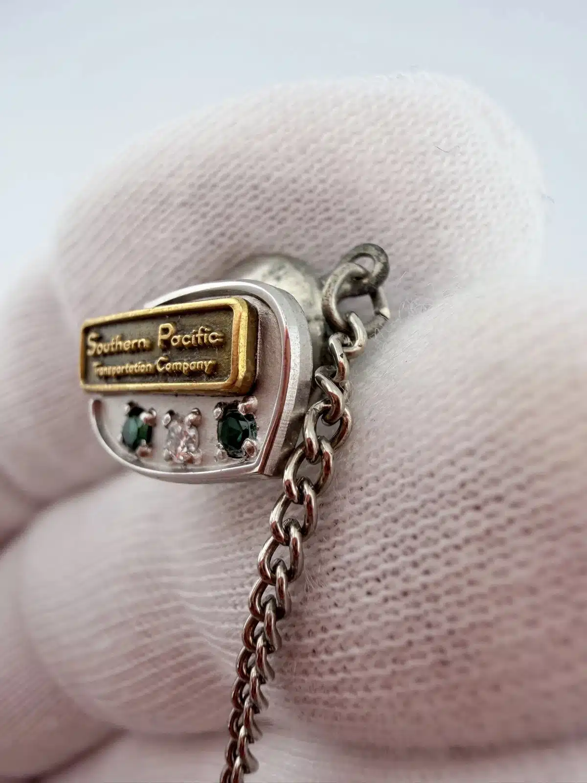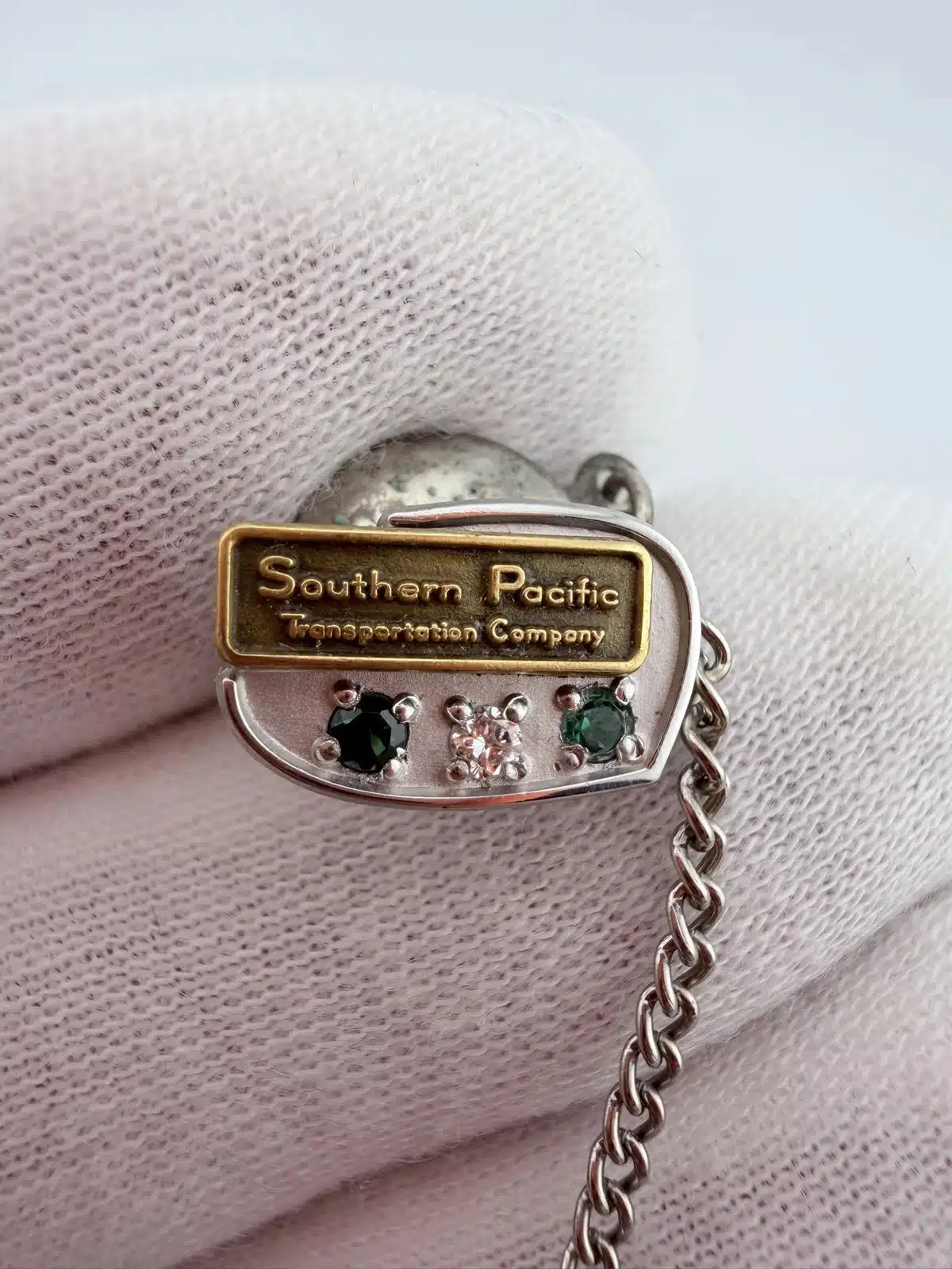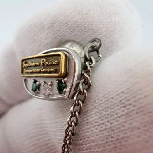 This Southern Pacific Transportation Company Employee Service Award pin features a silver tone base with a raised gold tone rectangular panel at the top left. Inside the rectangle, the words “Southern Pacific Transportation Company” are clearly displayed, creating a clean and distinguished presentation.