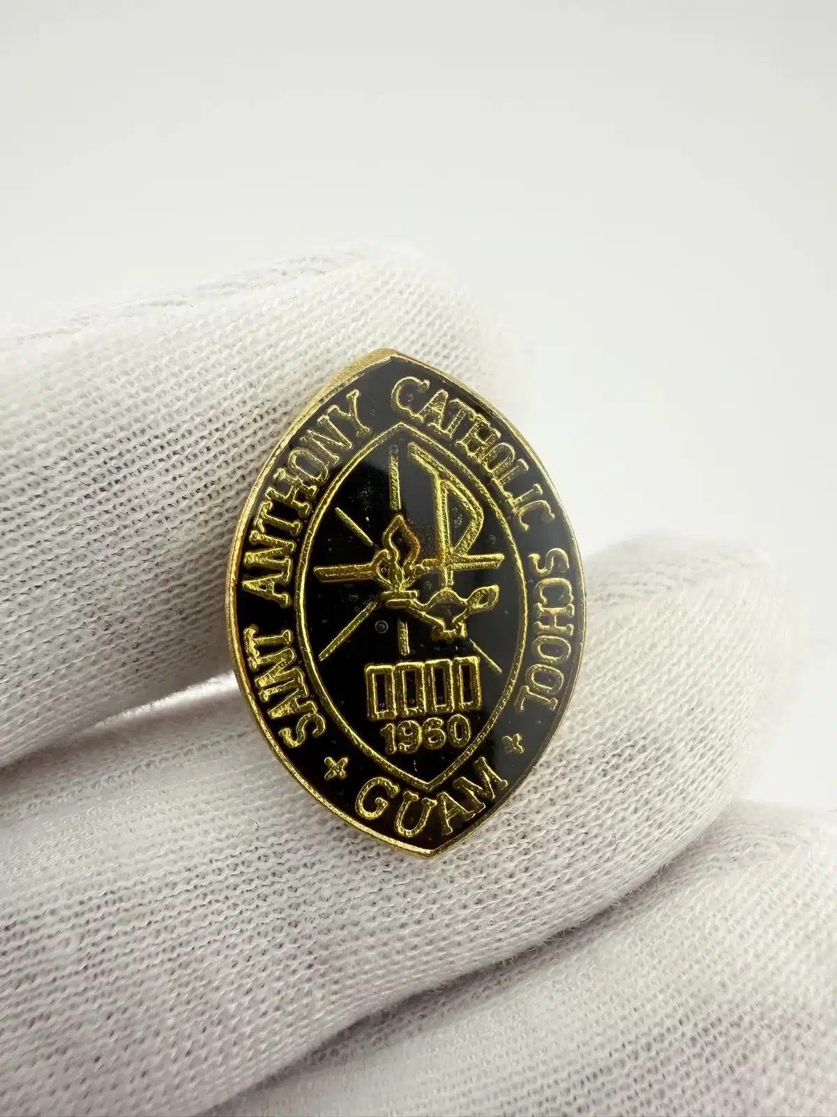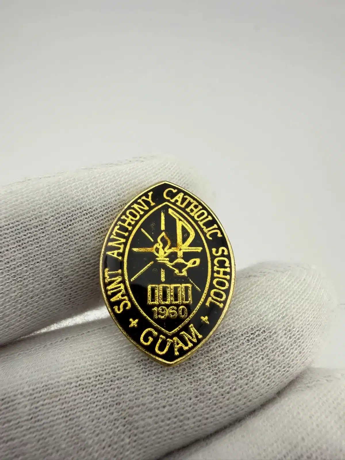 This pin features the emblem of St. Anthony Catholic School, which was established in Guam in 1960, showcasing its significance in the local community. Beautiful rare item which is likely vintage.
